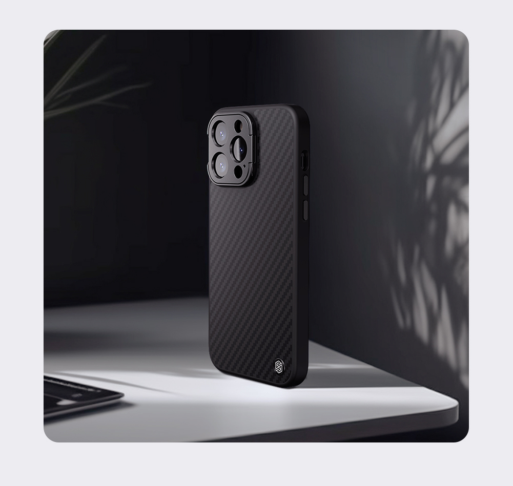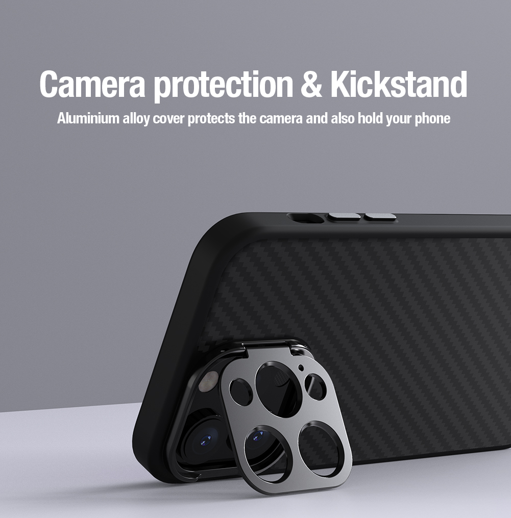 Чехол из арамидного карбона (широко известного в индустрии материалов как "black gold") с металлической откидной крышкой для камеры от Nillkin серии CarboProp Magnetic Case (Camera-visible Version) с функцией поддержки магнитной беспроводной зарядки MagSafe для телефона iPhone 14 Pro Max.