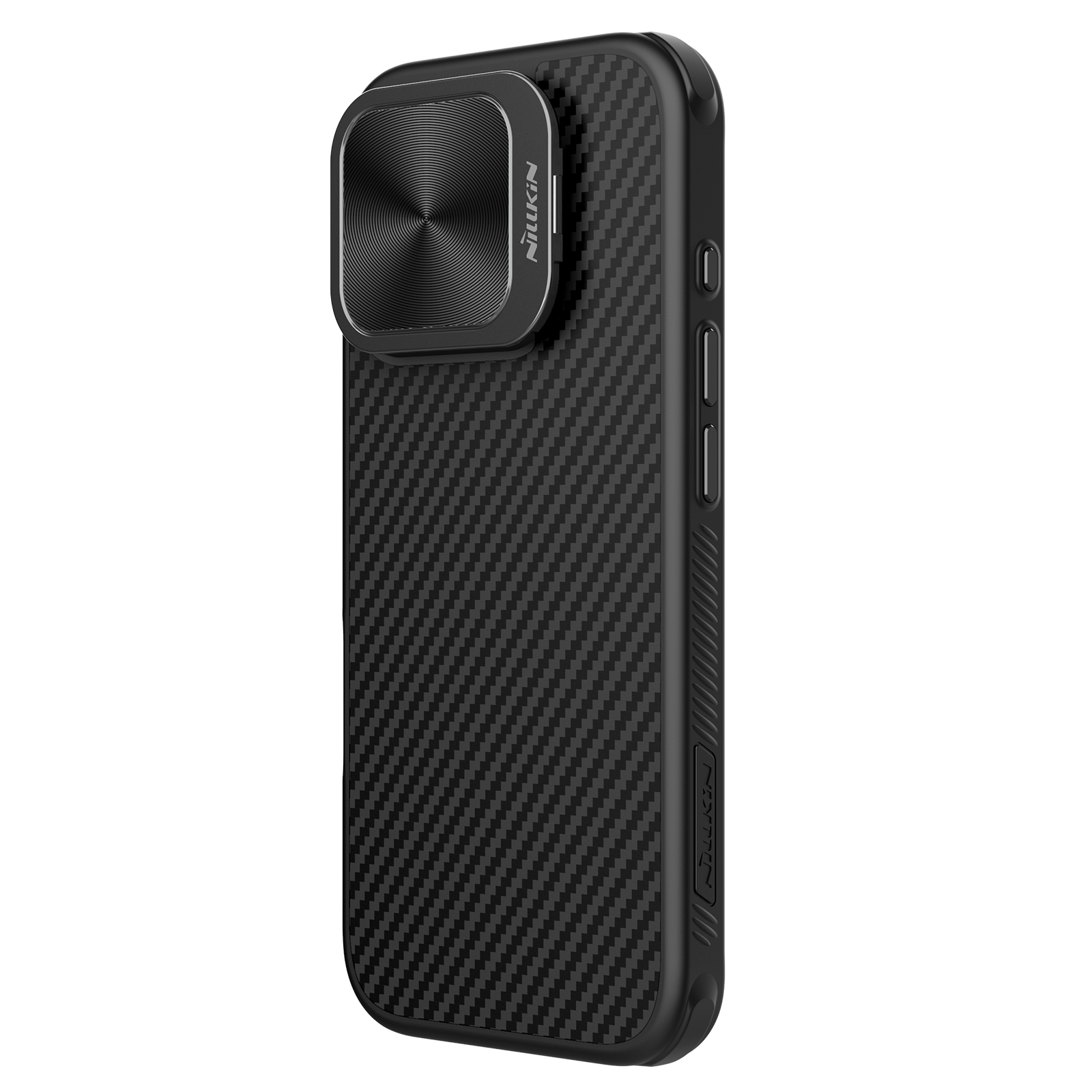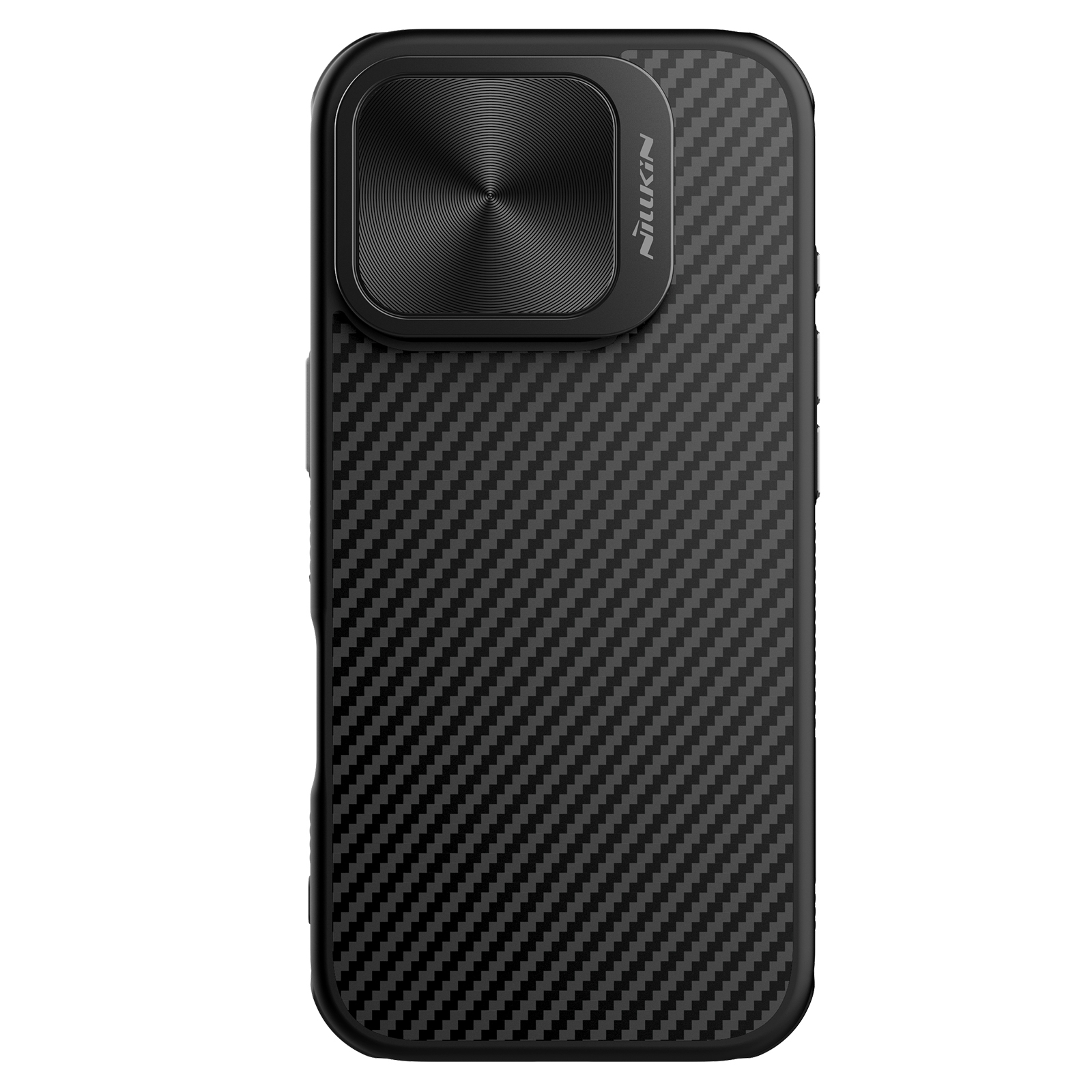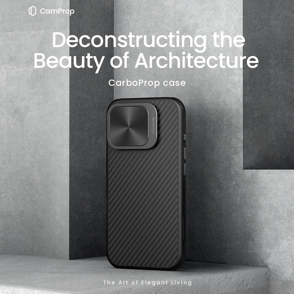 Чехол из арамидного карбона (широко известного в индустрии материалов как "black gold") с металлической откидной крышкой для камеры от Nillkin серии CarboProp Magnetic Case с функцией поддержки магнитной беспроводной зарядки MagSafe для телефона iPhone 16 Pro.