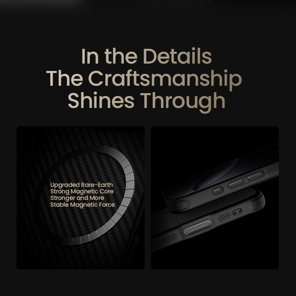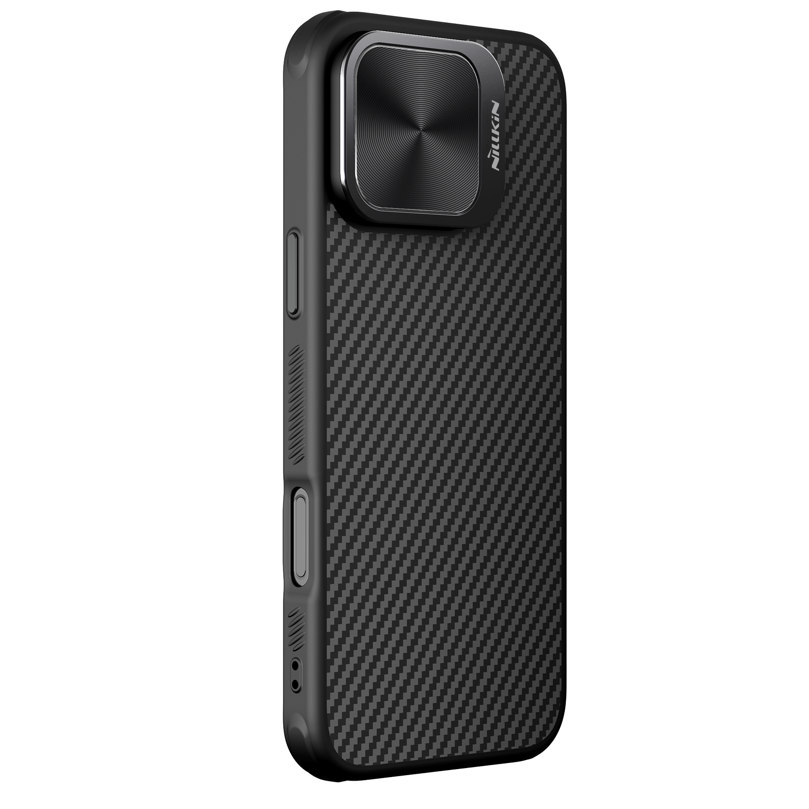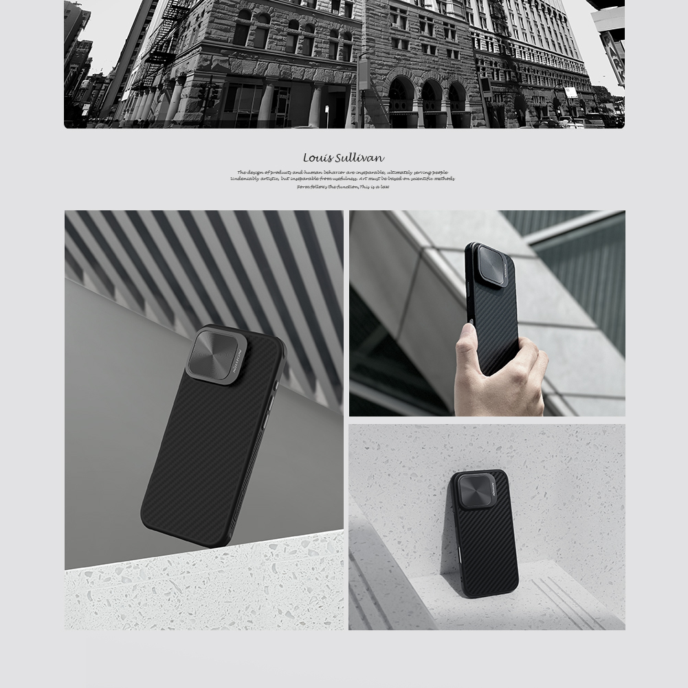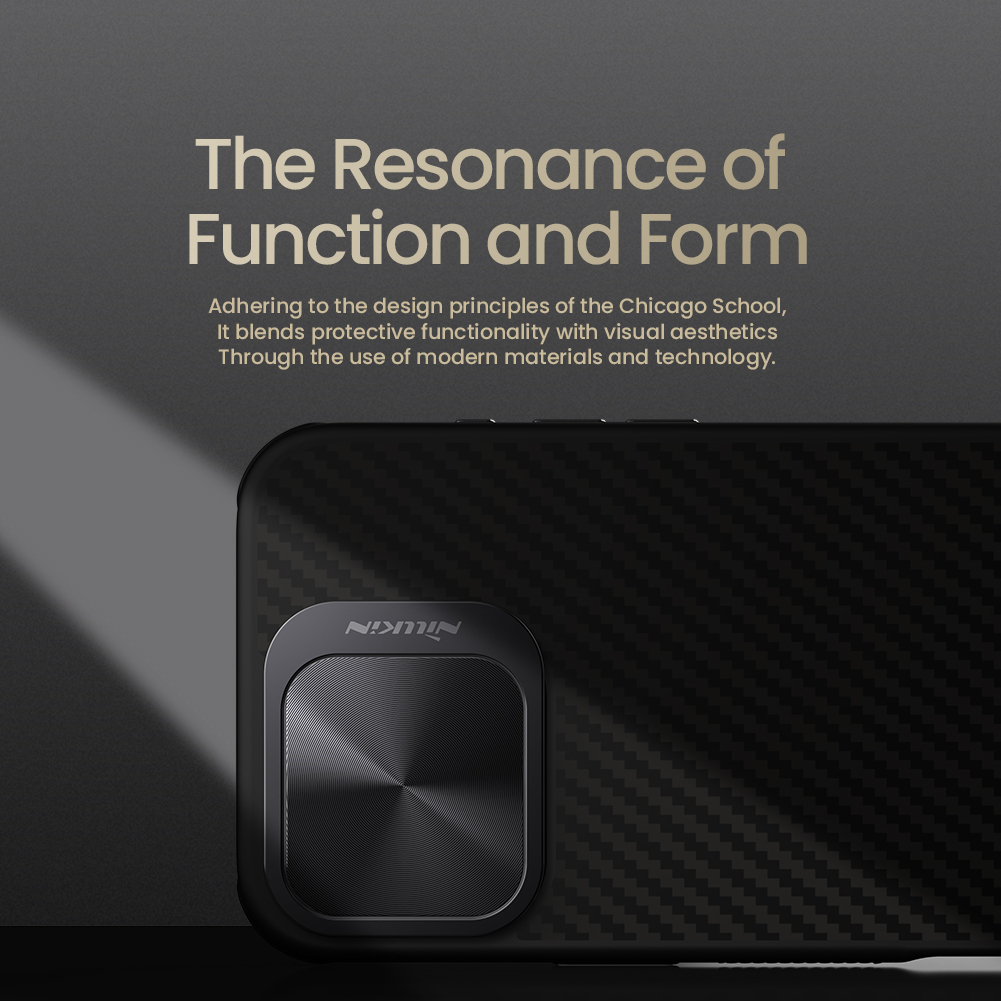 Чехол из арамидного карбона (широко известного в индустрии материалов как "black gold") с металлической откидной крышкой для камеры от Nillkin серии CarboProp Magnetic Case с функцией поддержки магнитной беспроводной зарядки MagSafe для телефона iPhone 16 Pro.