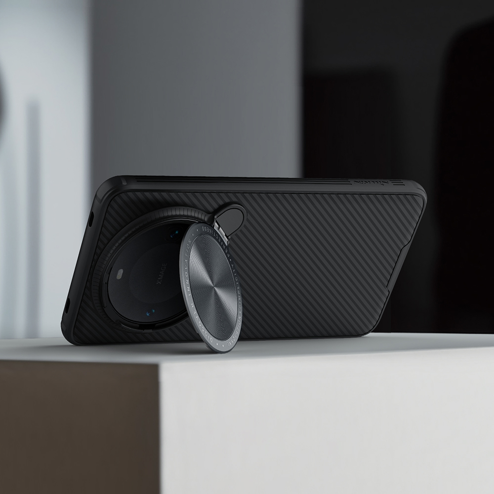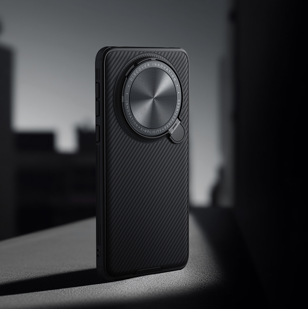 Противоударный чехол черного цвета с откидной металлической защитной крышкой для камеры от Nillkin серии CamShield Prop Magnetic Case для телефона Huawei Mate 60 Pro и 60 Pro+ создан для любителей активного отдыха.