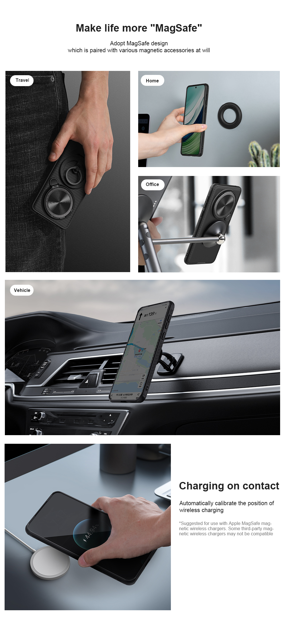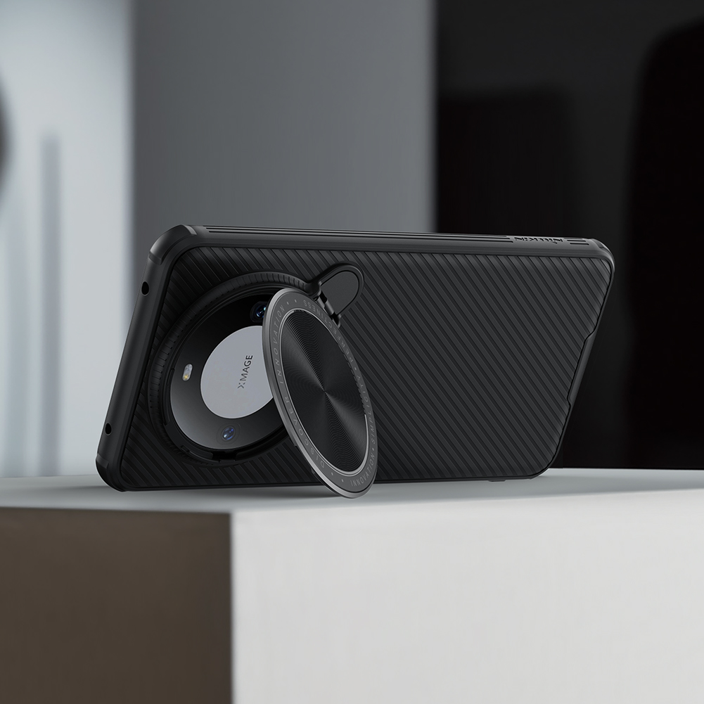Противоударный чехол черного цвета с откидной металлической защитной крышкой для камеры от Nillkin серии CamShield Prop Magnetic Case для телефона Huawei Mate 60 создан для любителей активного отдыха.