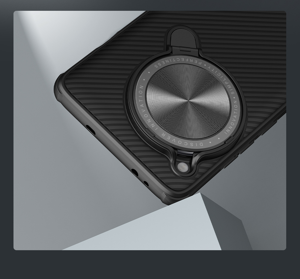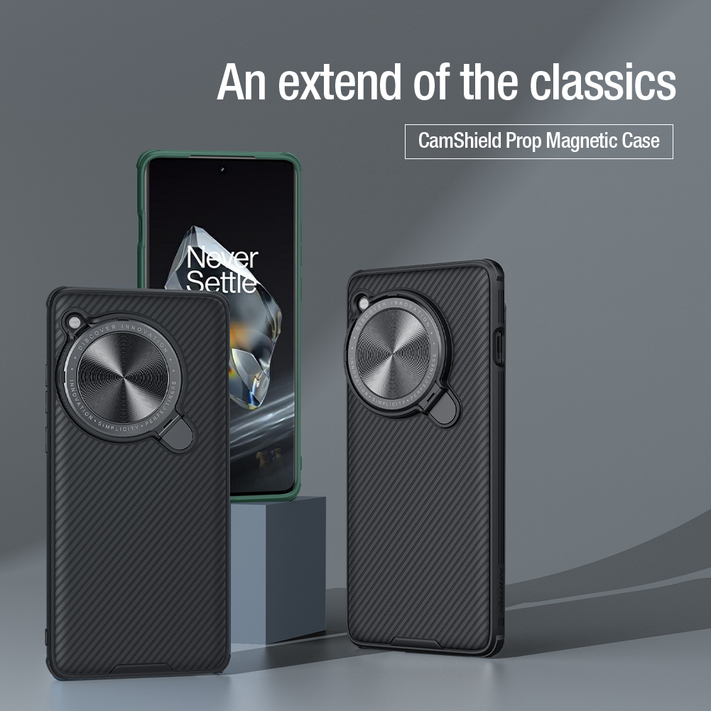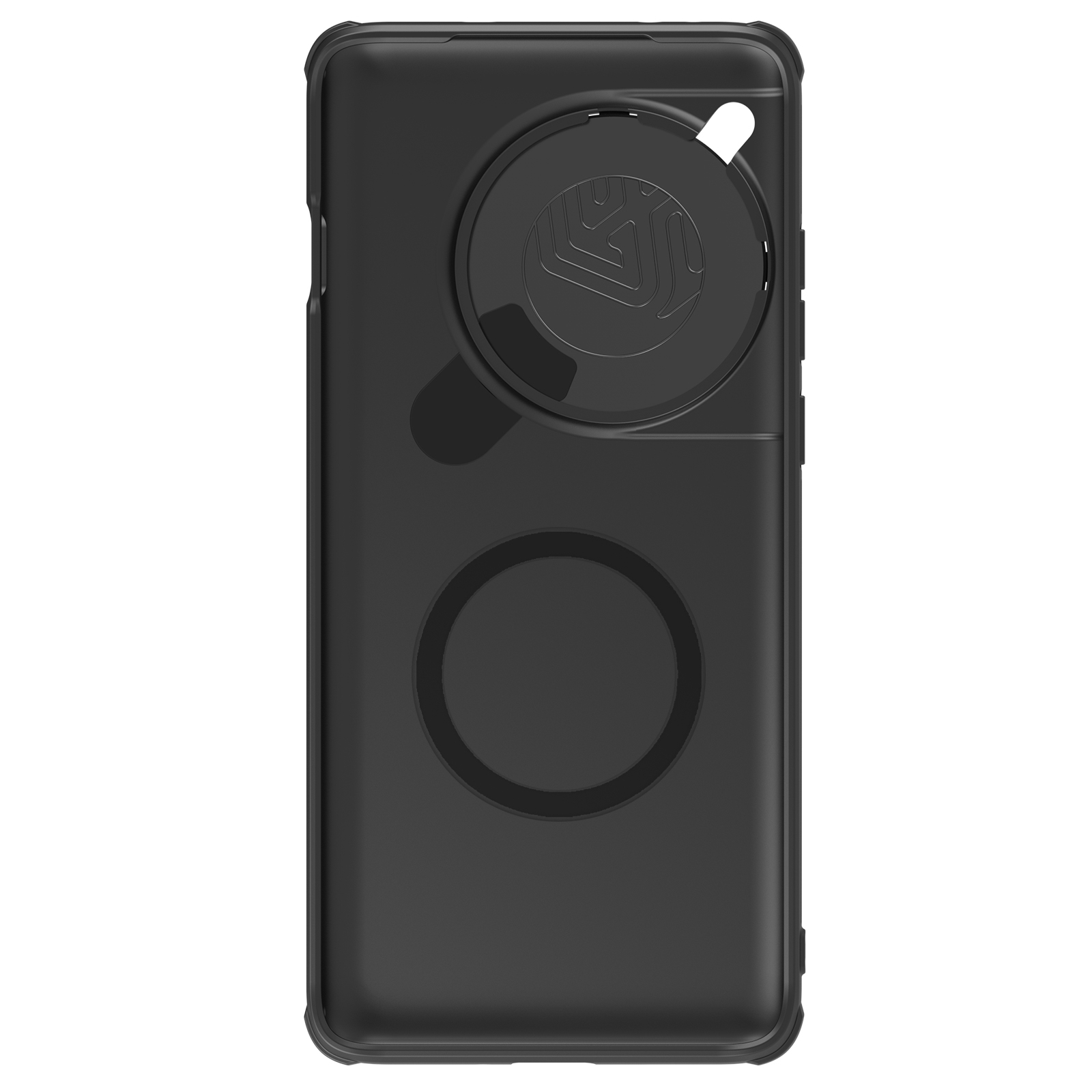 Противоударный чехол черного цвета с откидной металлической защитной крышкой для камеры от Nillkin серии CamShield Prop Magnetic Case для телефона OnePlus 12 создан для любителей активного отдыха.