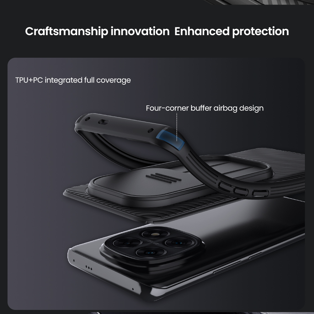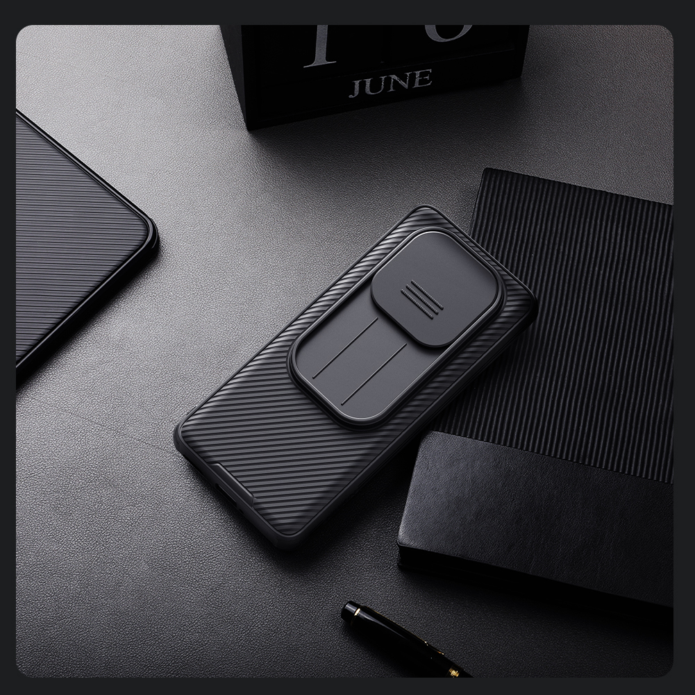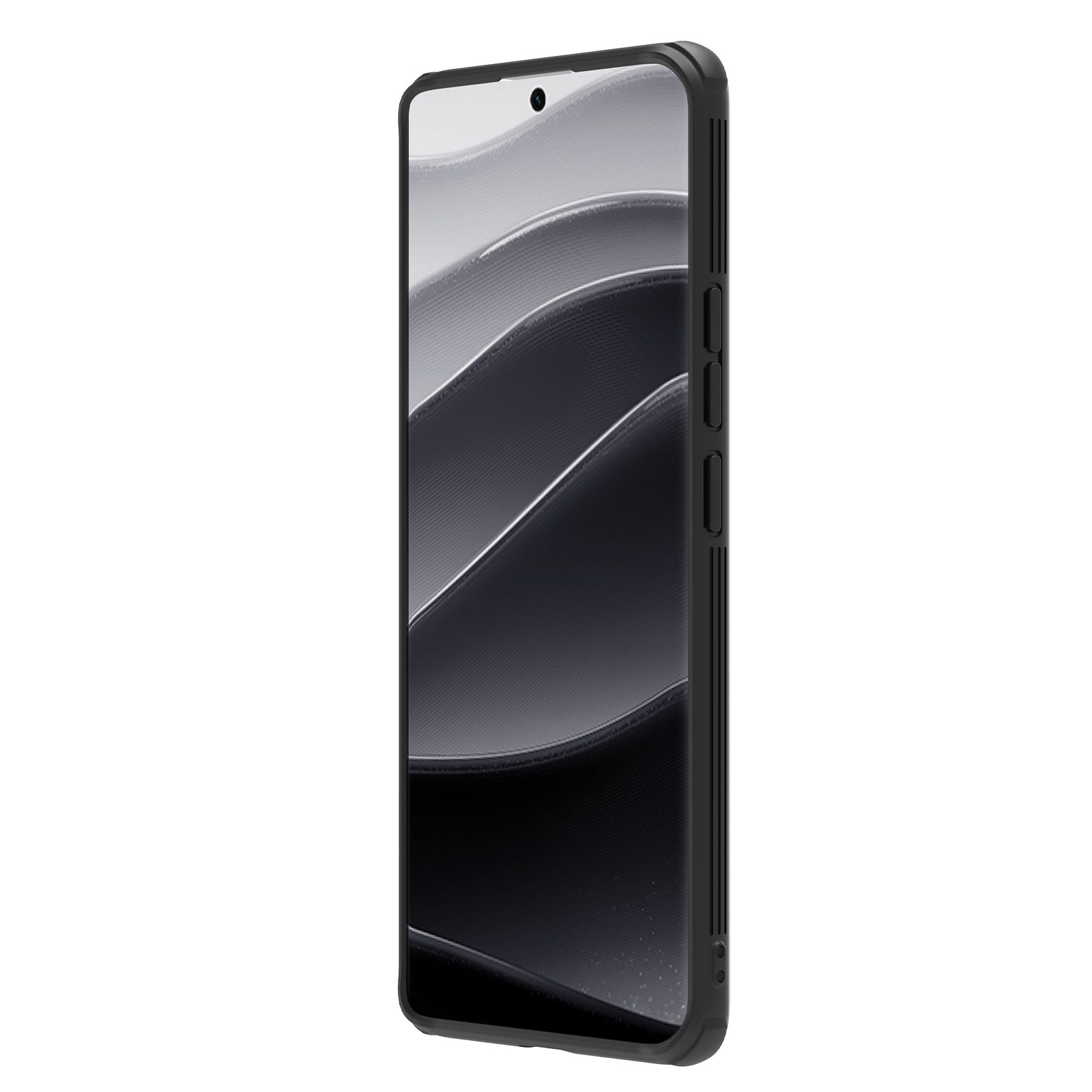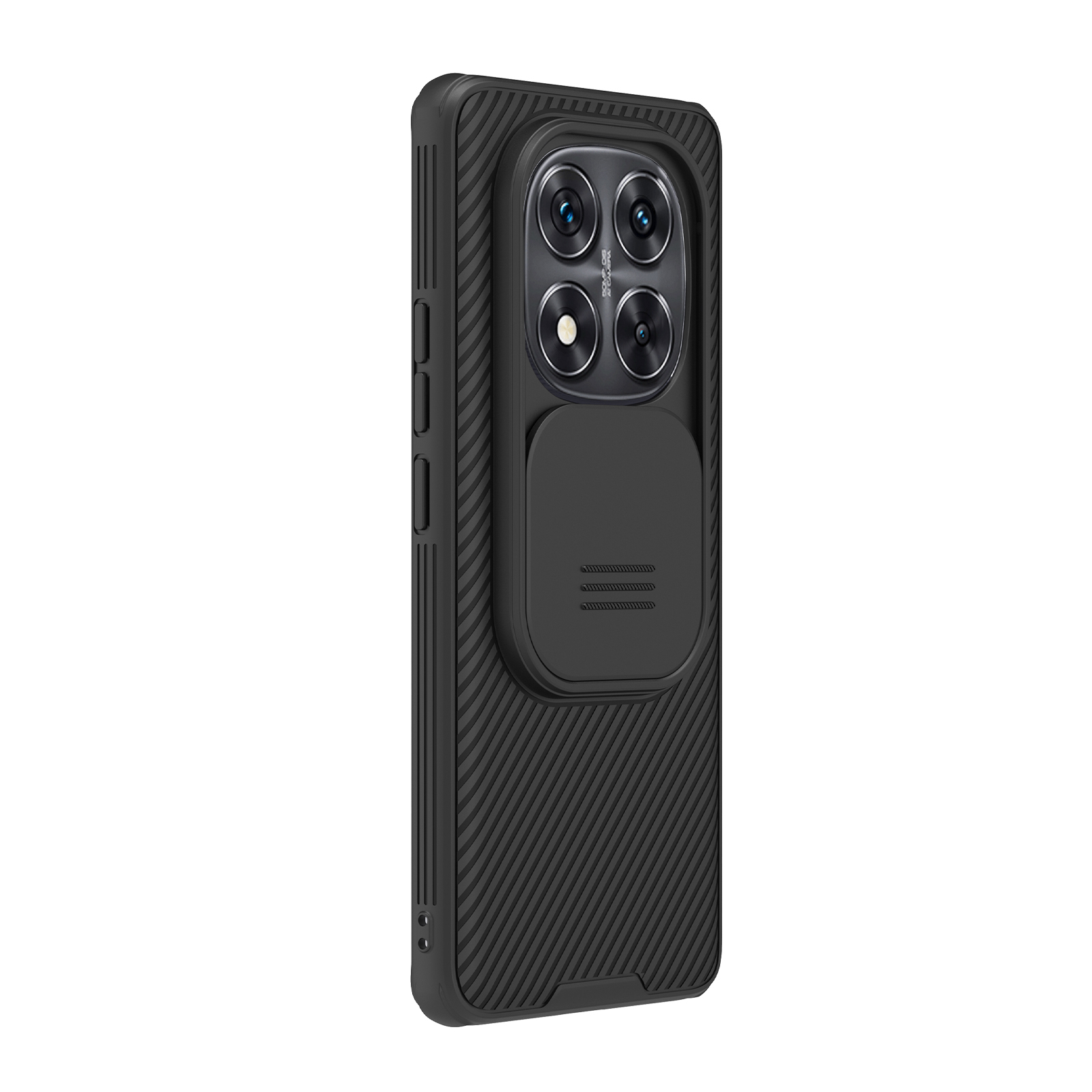 Противоударный чехол черного цвета с защитной шторкой задней камеры от Nillkin серии CamShield Pro Case для телефона Xiaomi Redmi Note 14 Pro+ 5G создан для любителей активного отдыха.