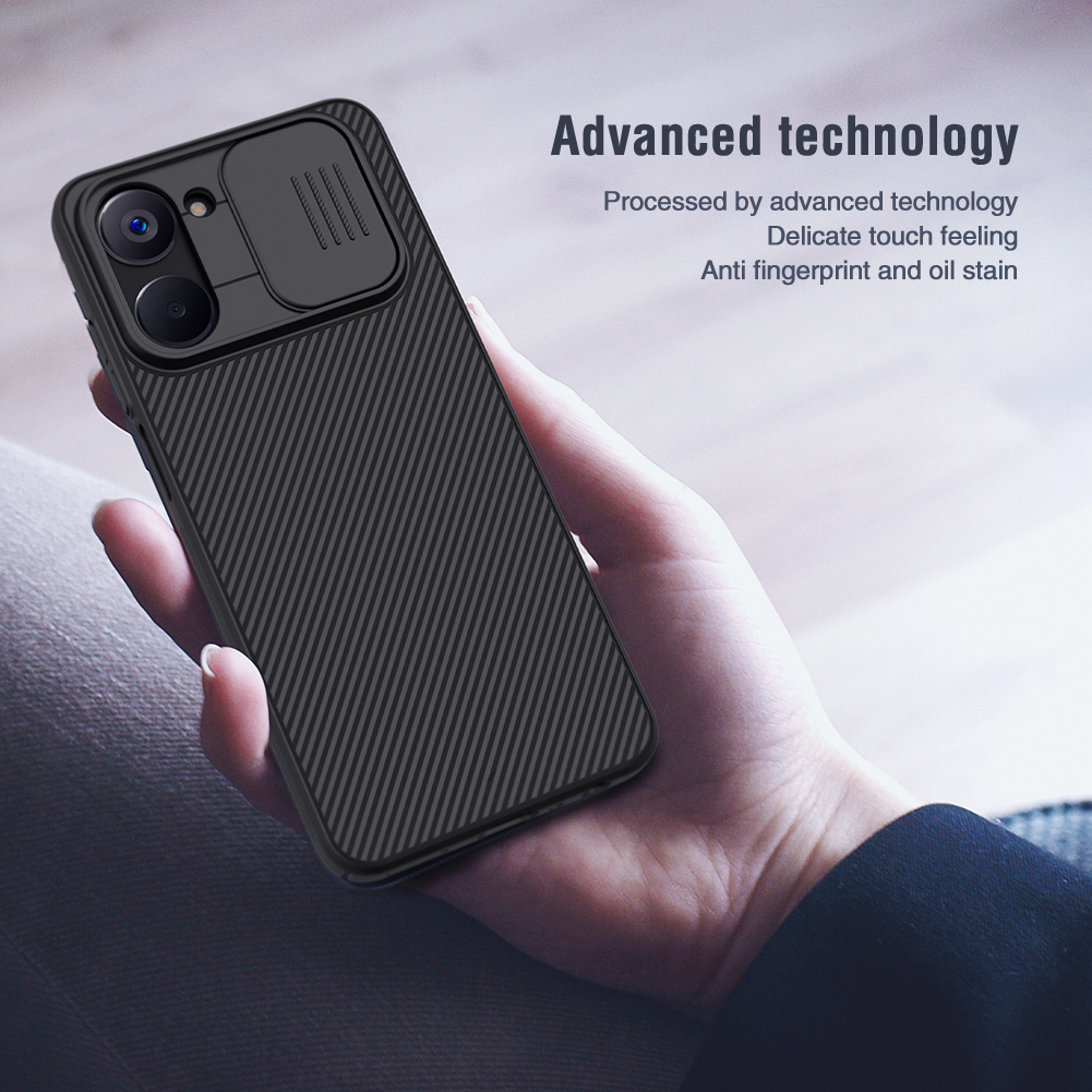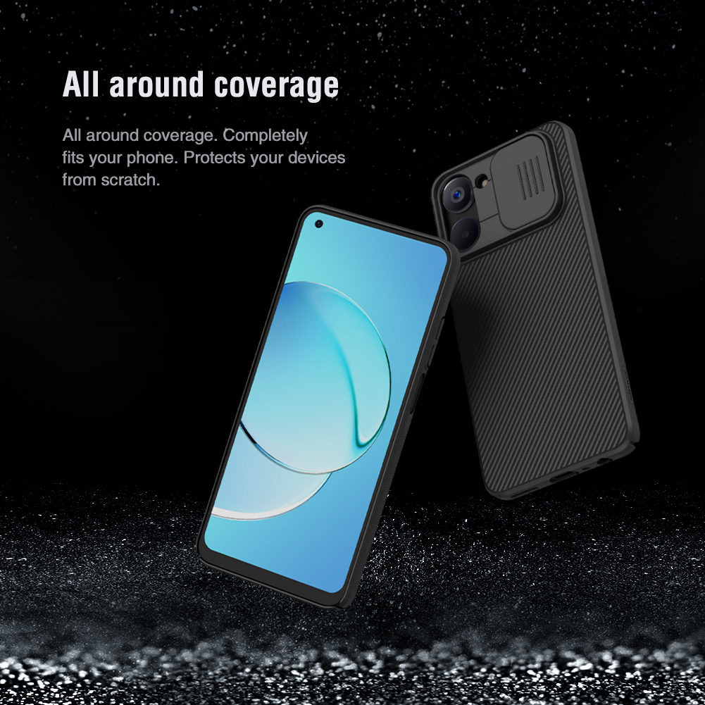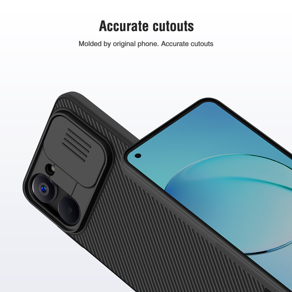 Противоударный чехол черного цвета с защитной крышкой задней камеры серии CamShield Case от Nillkin для смартфона Realme 10 4G создан для любителей активного отдыха.