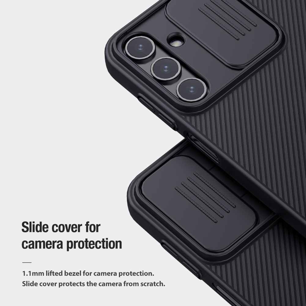 Противоударный тонкий жесткий чехол черного цвета с защитной крышкой задней камеры серии CamShield Case от Nillkin для смартфона Samsung Galaxy A25 5G создан для любителей активного отдыха.