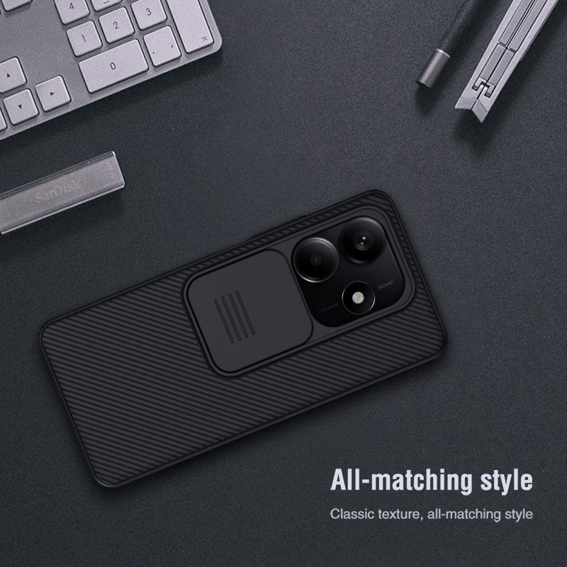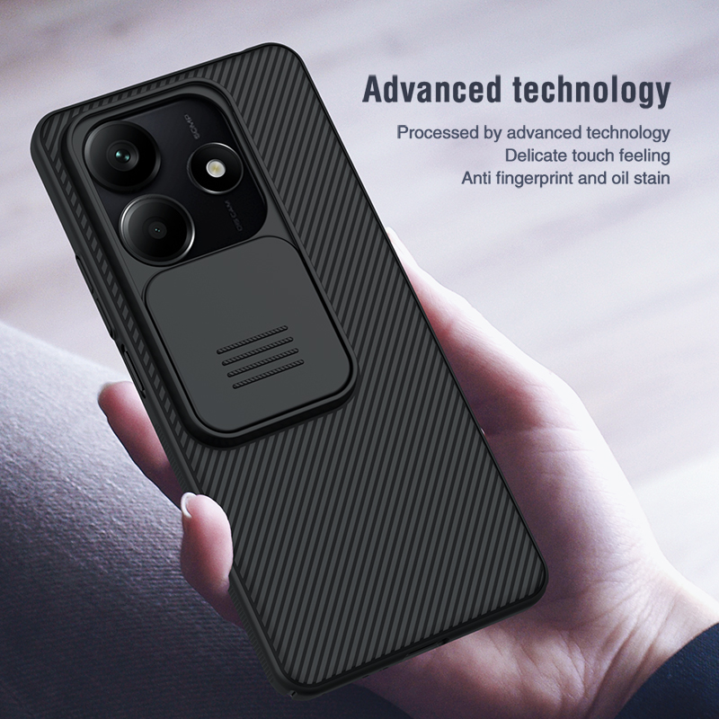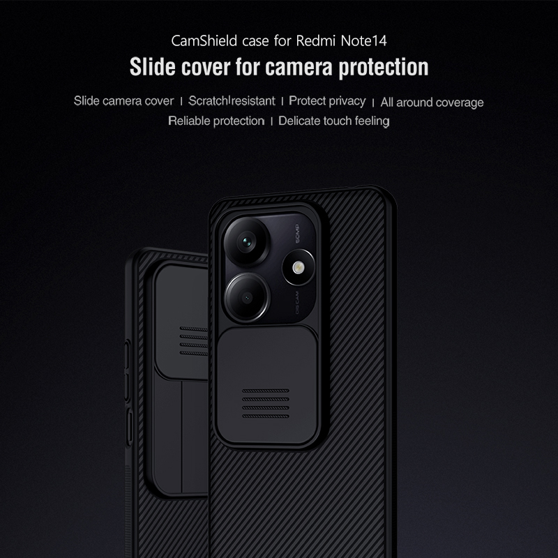 Противоударный тонкий жесткий чехол черного цвета с защитной крышкой задней камеры серии CamShield Case от Nillkin для смартфона Xiaomi Redmi Note 14 5G создан для любителей активного отдыха.