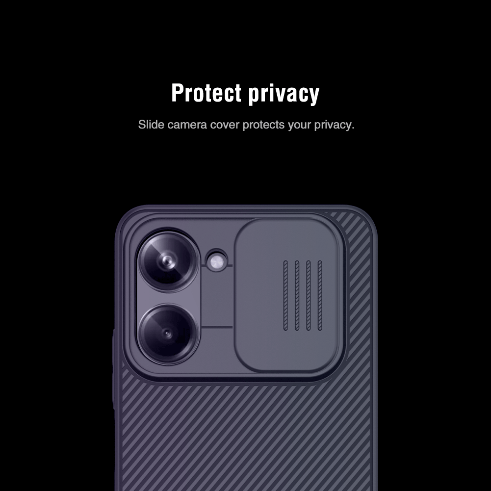 Противоударный чехол черного цвета с защитной крышкой задней камеры серии CamShield Case от Nillkin для смартфона Realme 10 Pro 5G создан для любителей активного отдыха.