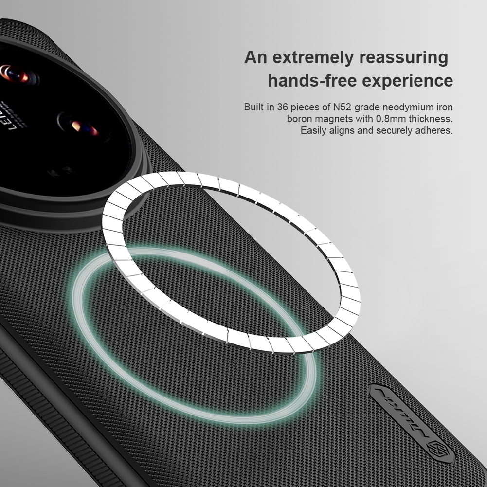 Защитный чехол черного цвета от Nillkin серии Super Frosted Shield Pro Magnetic для смартфона Xiaomi 14 Ultra с усиленными боковыми рамками по четырем углам и поддержкой зарядки MagSafe, изготавливается из экологичных материалов PC и TPU путем высокоточного литья под давление с высокой температурой.