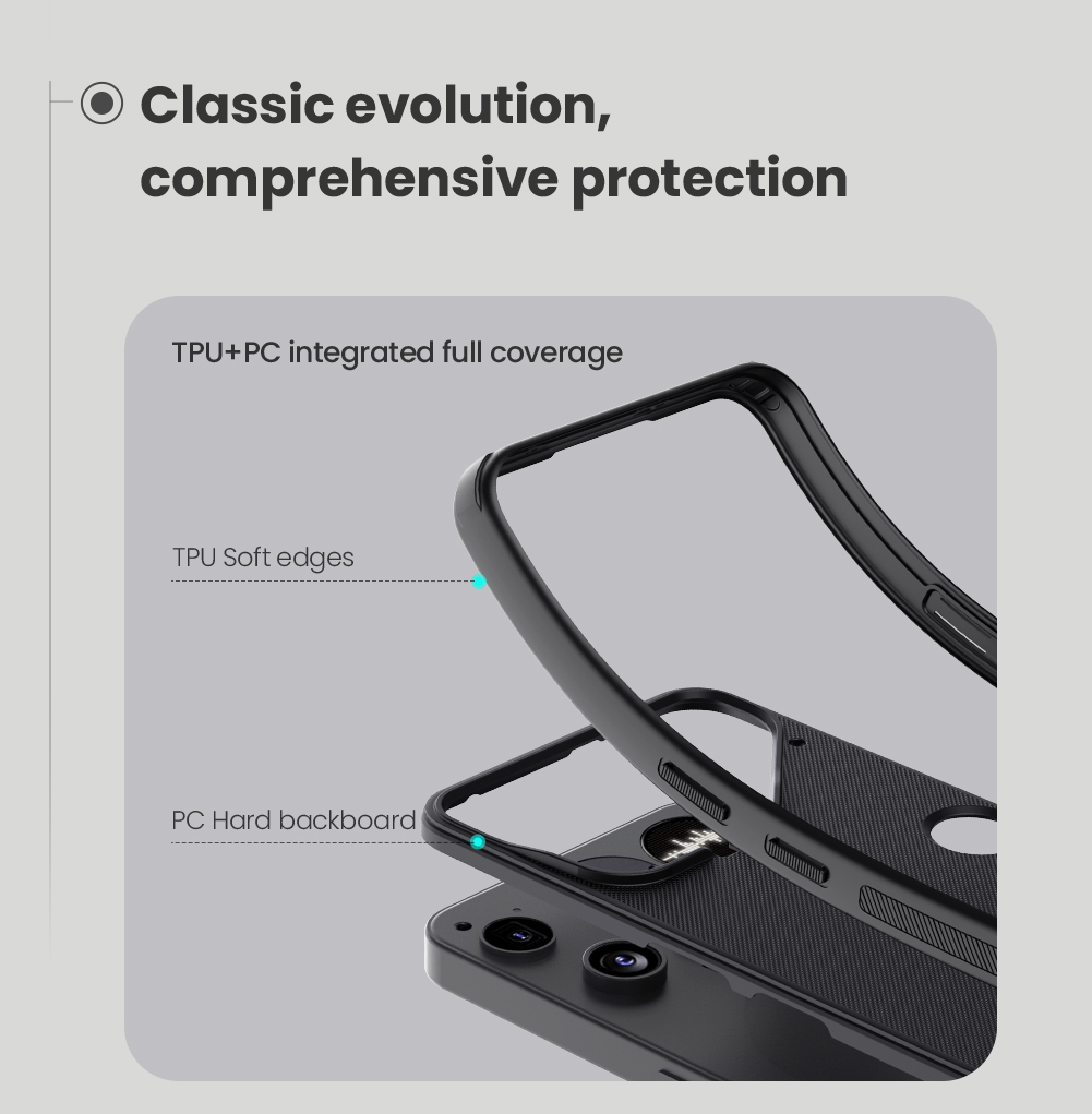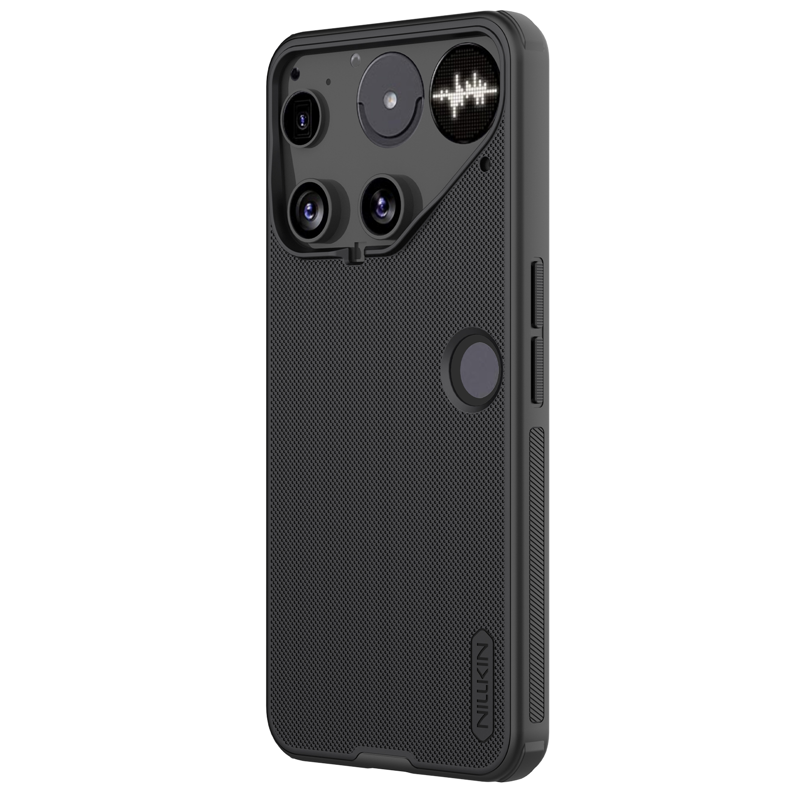 Защитный чехол черного цвета от Nillkin серии Super Frosted Shield Pro для смартфона Nothing Phone 3 с усиленными боковыми рамками по четырем углам, изготавливается из экологичных материалов PC и TPU путем высокоточного литья под давление с высокой температурой.