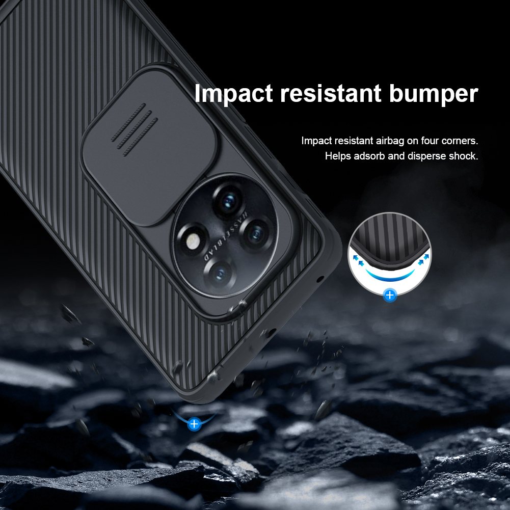 Противоударный чехол черного цвета с защитной шторкой задней камеры от Nillkin серии CamShield Pro Case для телефона Oneplus 11 создан для любителей активного отдыха.