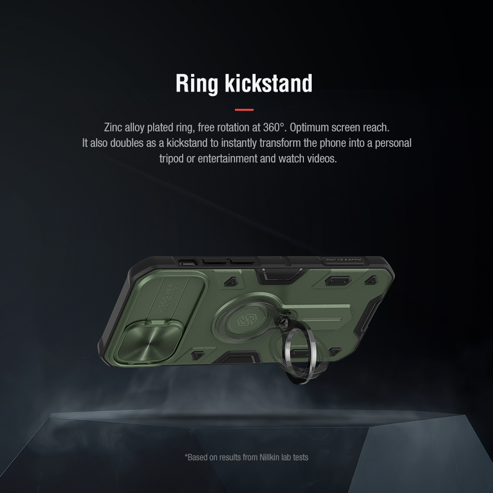 Противоударный чехол зеленого цвета (Dark Green) с кольцом и металлической защитной крышкой для задней камеры от Nillkin серии CamShield Armor Case для телефона iPhone 12 mini создан для любителей активного отдыха.