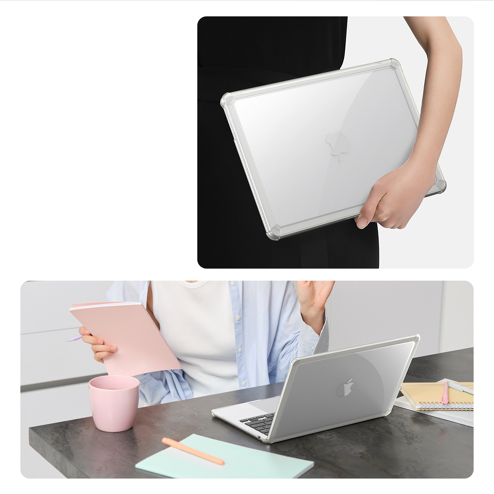 Середина выполнена из прозрачного поликарбонатного листа, окруженного утолщенным жестким слоем из термопластичного полиуретана (TPU). Чехол обеспечивает всестороннюю защиту и устойчив к трещинам и царапинам. Матовая поверхность с олеофобным слоем предотвращает появление отпечатков пальцев и пятен, сохраняя ваш ноутбук MacBook Pro диагональю 14 выпуск 2021, 2023-2024 чистым как новый в течение длительного времени. Тепло легко отводится через вентиляционные отверстия, сохраняя MacBook прохладным.