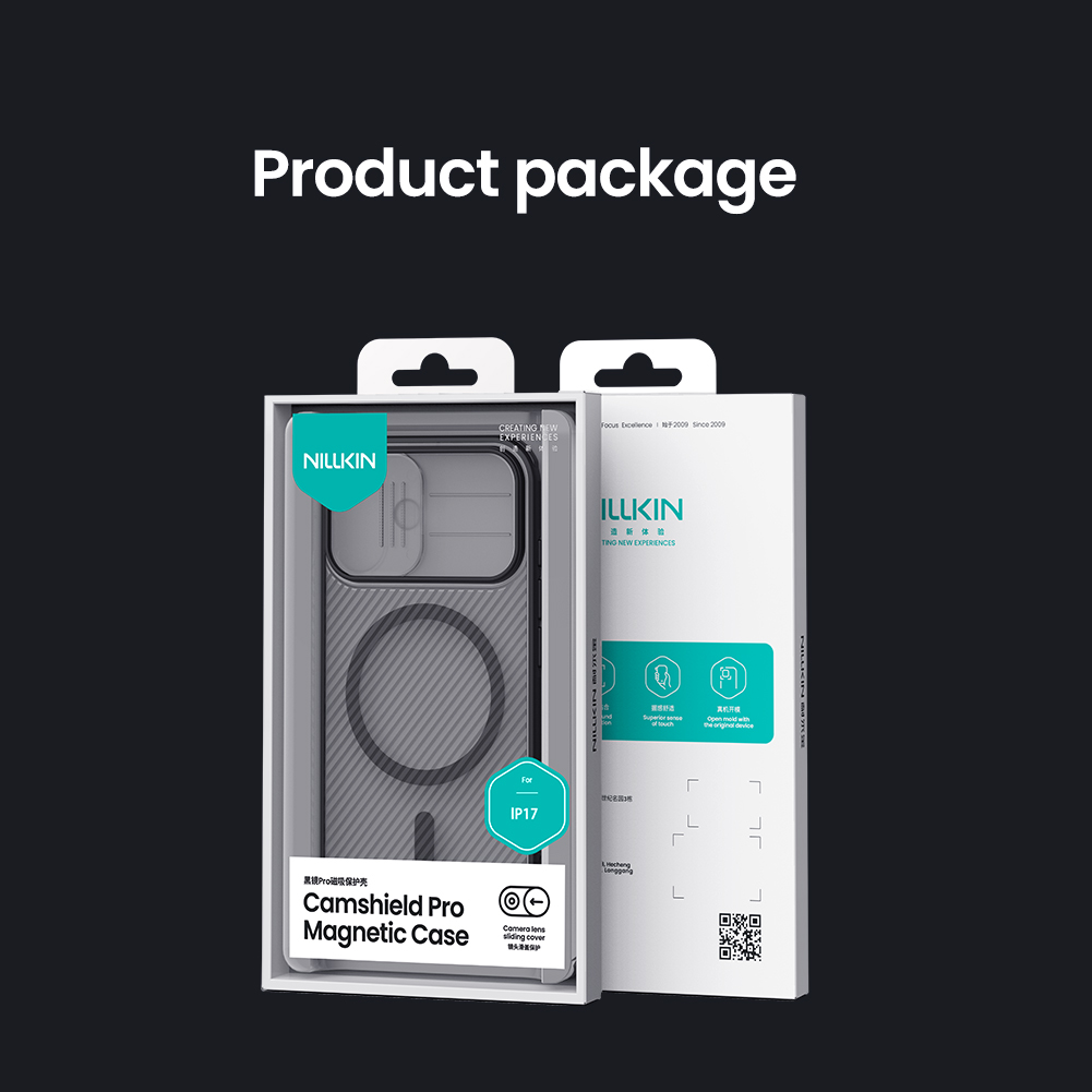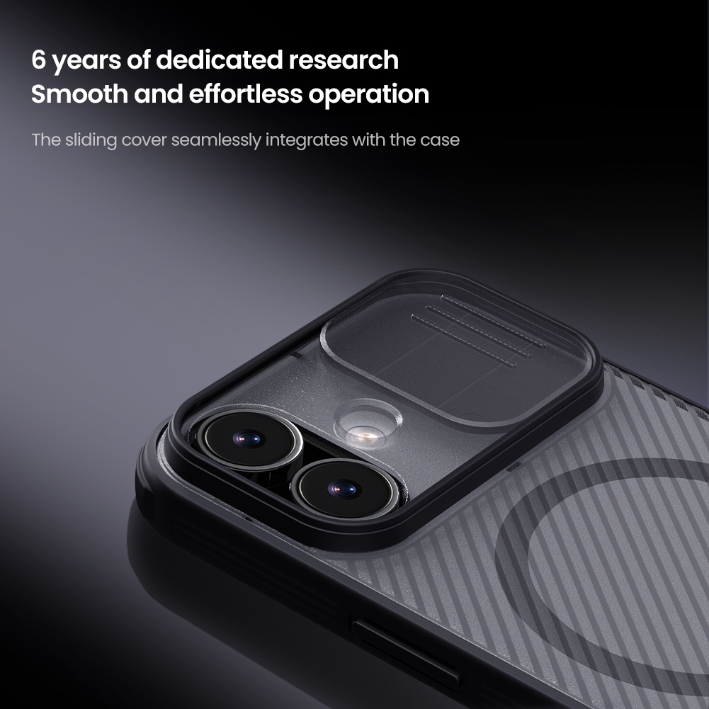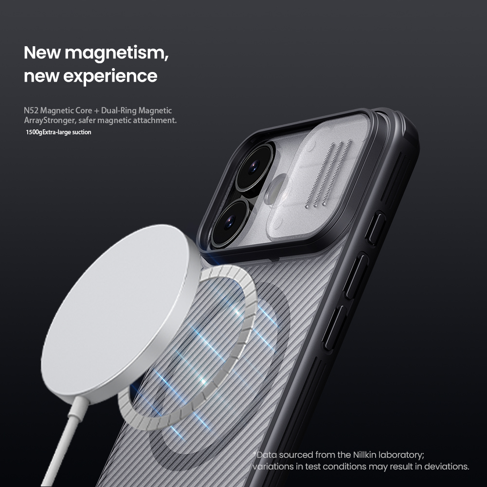 Противоударный чехол прозрачный тонированный (Transparent black) с защитной шторкой задней камеры и беспроводной магнитной зарядкой MagSafe от Nillkin серии CamShield Pro Magnetic Case для телефона iPhone 17 создан для любителей активного отдыха.