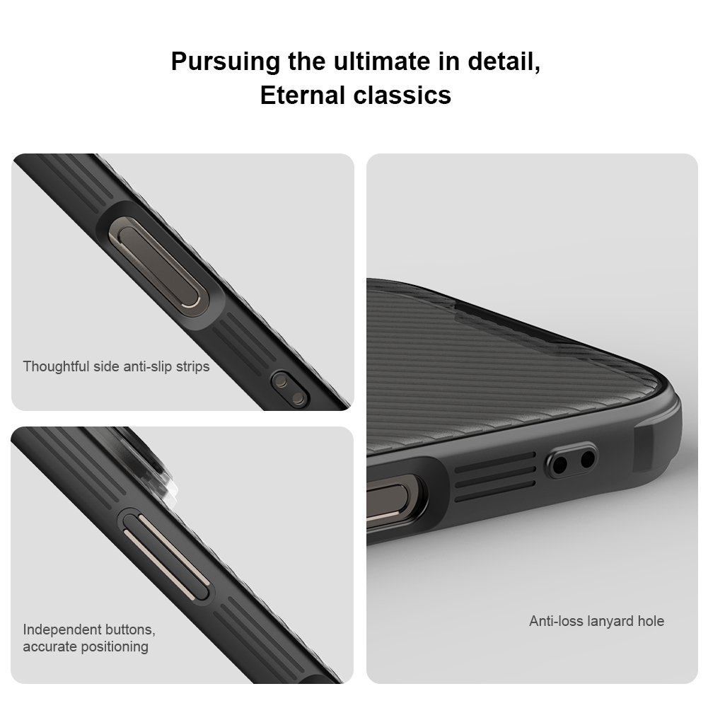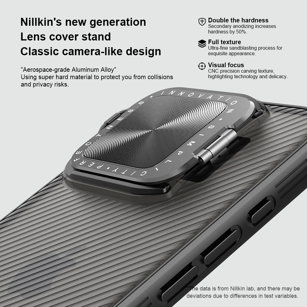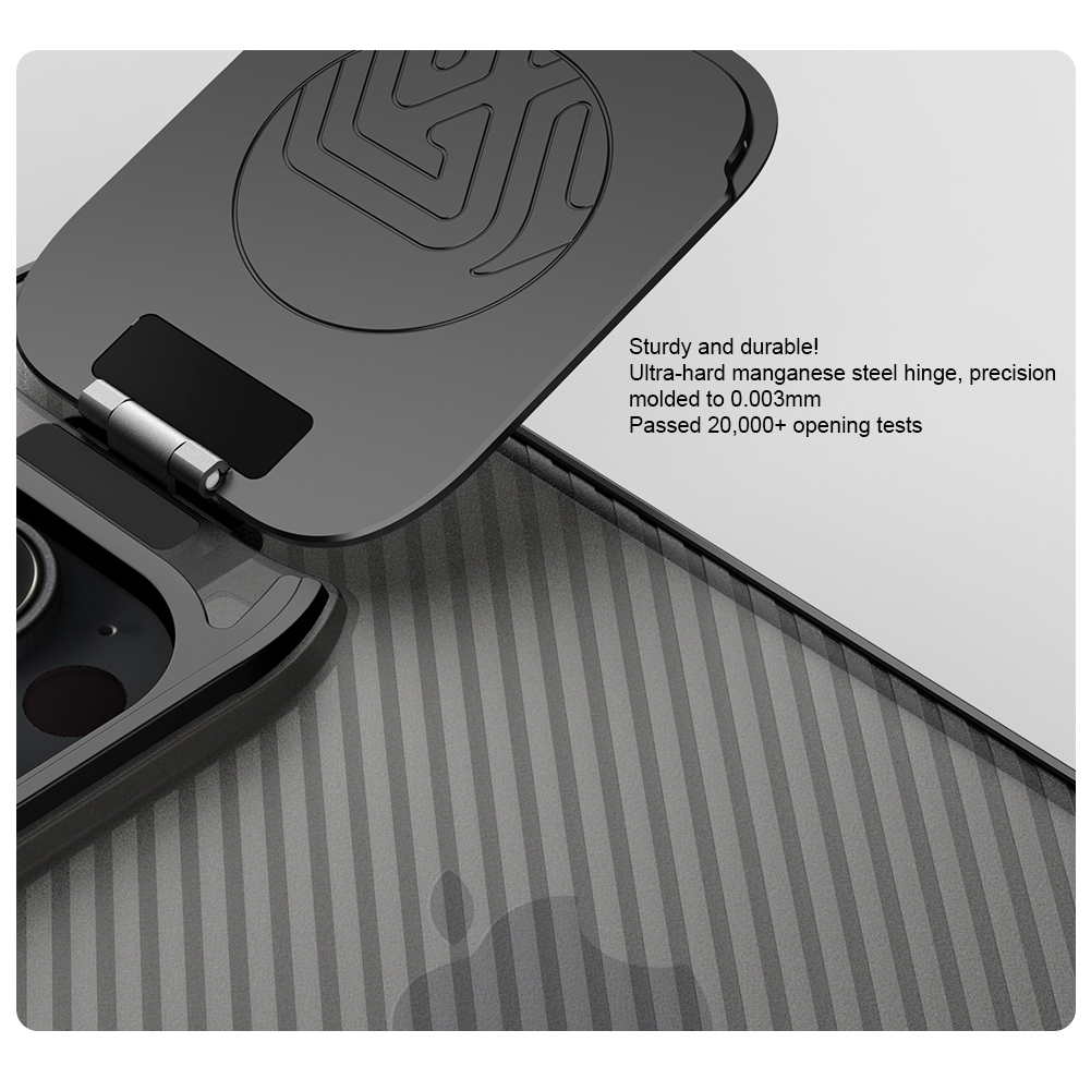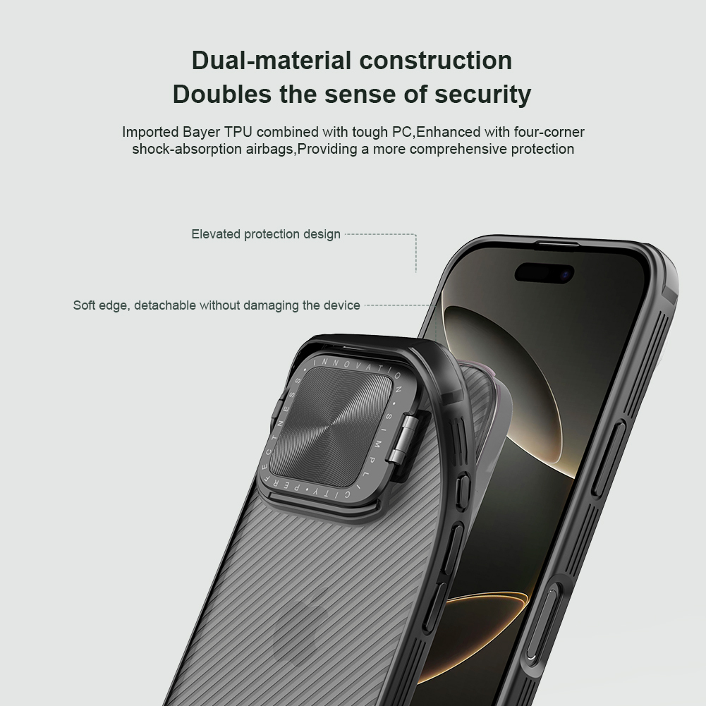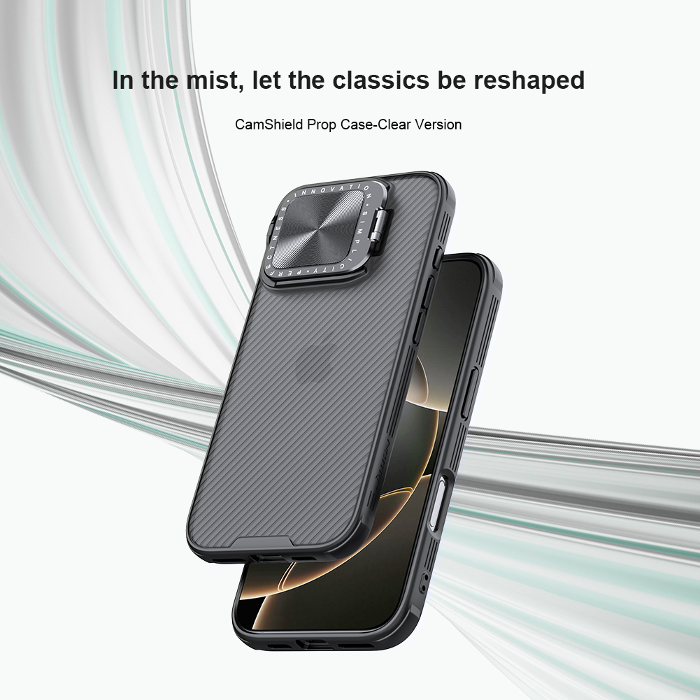 Противоударный чехол прозрачный тонированный (Transparent Black) с откидной металлической защитной крышкой для камеры от Nillkin серии CamShield Prop Case для телефона iPhone 16 Pro создан для любителей активного отдыха.