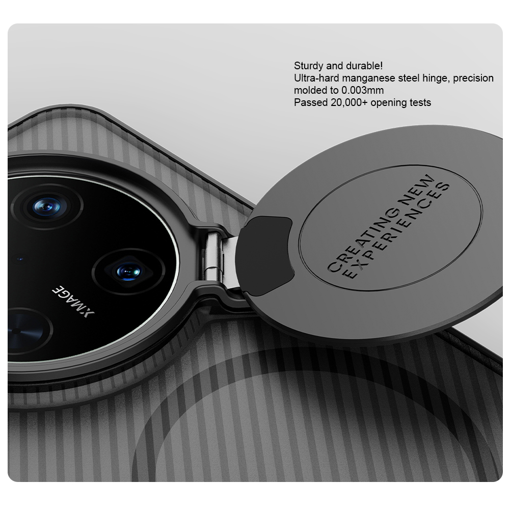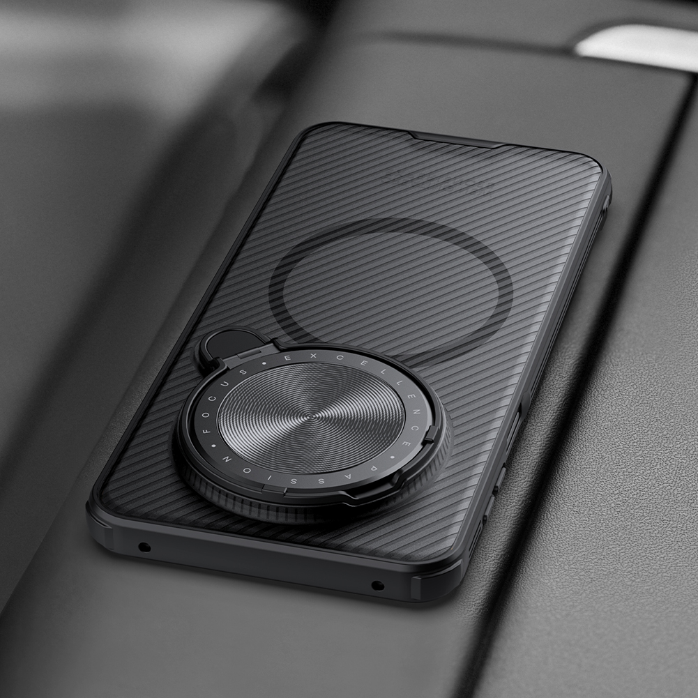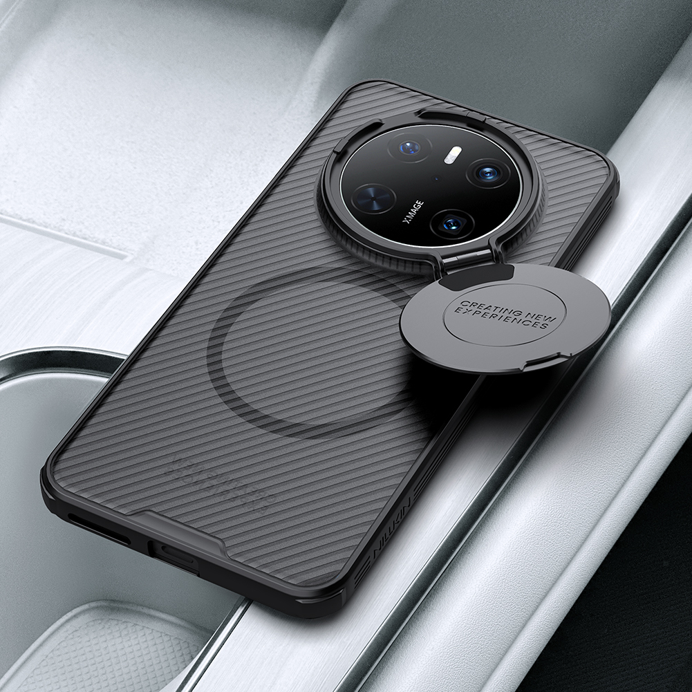 Противоударный чехол прозрачный тонированный (Transparent Black) с откидной металлической защитной крышкой для камеры и поддержкой магнитной беспроводной зарядки MagSafe от Nillkin серии CamShield Prop Magnetic Case для телефона Huawei Mate 70 создан для любителей активного отдыха.