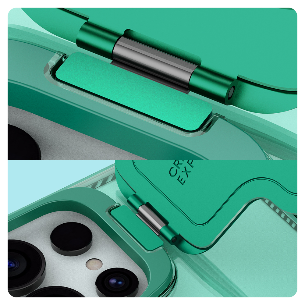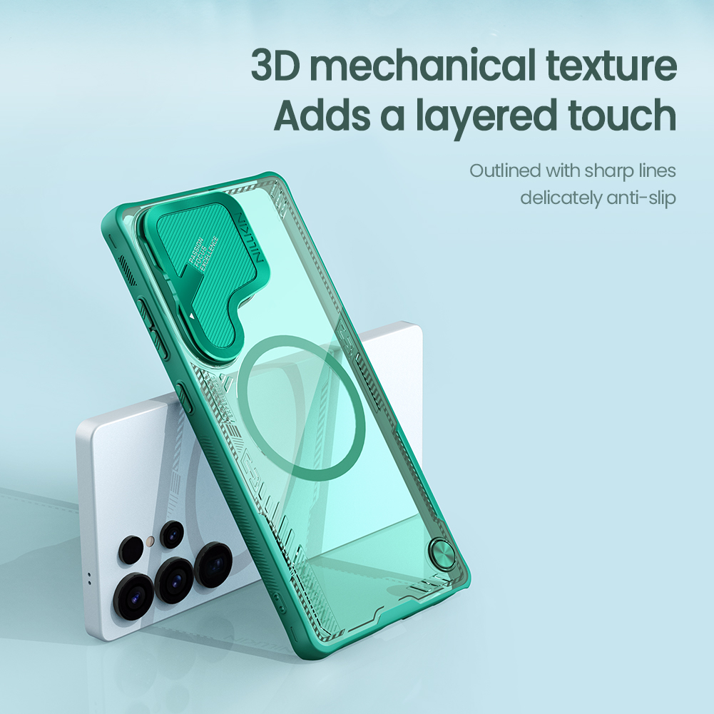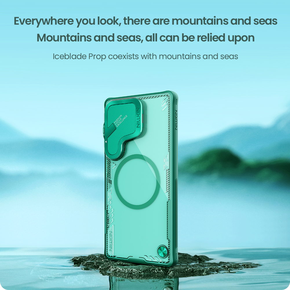 Противоударный чехол прозрачный зеленого цвета с металлической откидной крышкой и поддержкой магнитной зарядки MagSafe от Nillkin серии Iceblade Prop Magnetic Case для телефона Samsung Galaxy S25 Ultra создан для любителей активного отдыха.