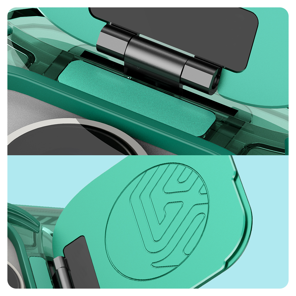 Противоударный чехол прозрачный зеленого цвета с откидной металлической защитной крышкой для камеры от Nillkin серии Iceblade Prop Case для телефона iPhone 16 Pro создан для любителей активного отдыха.