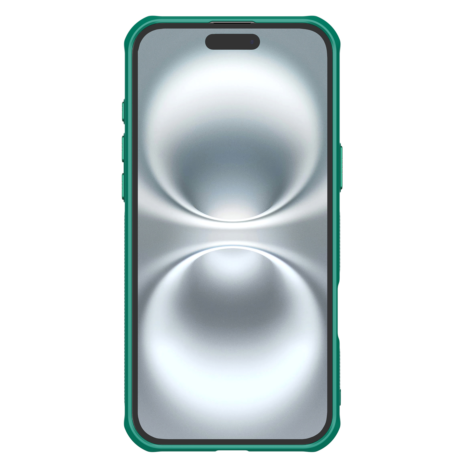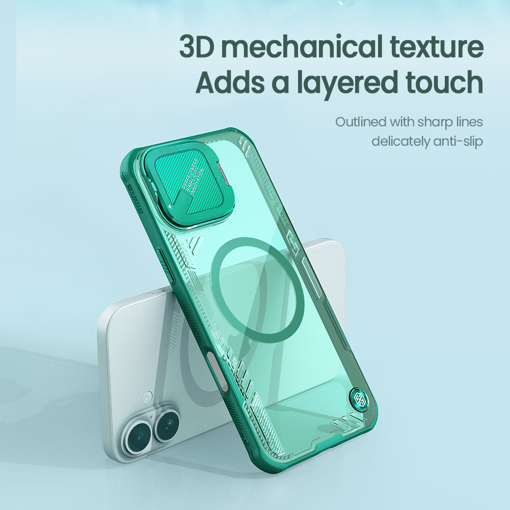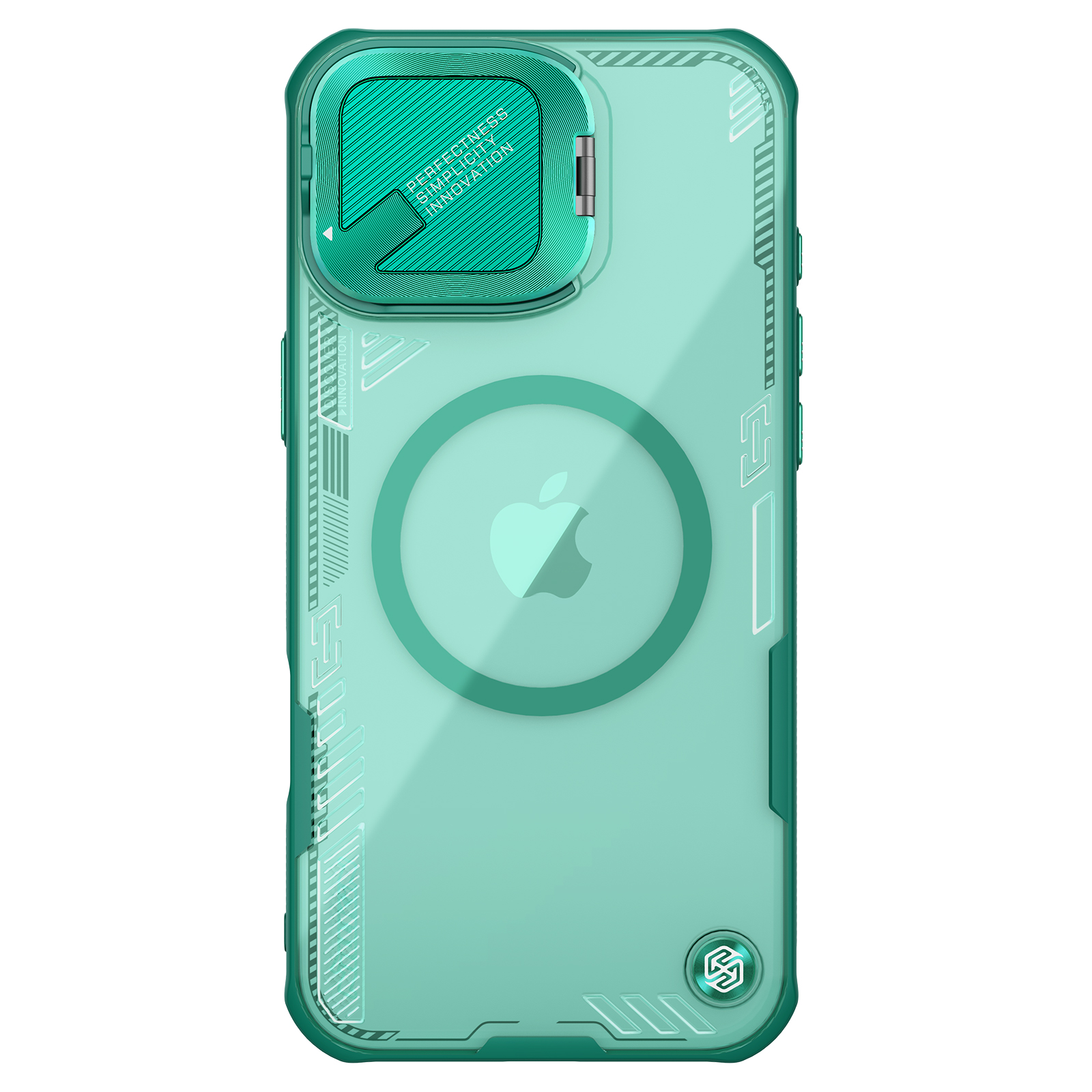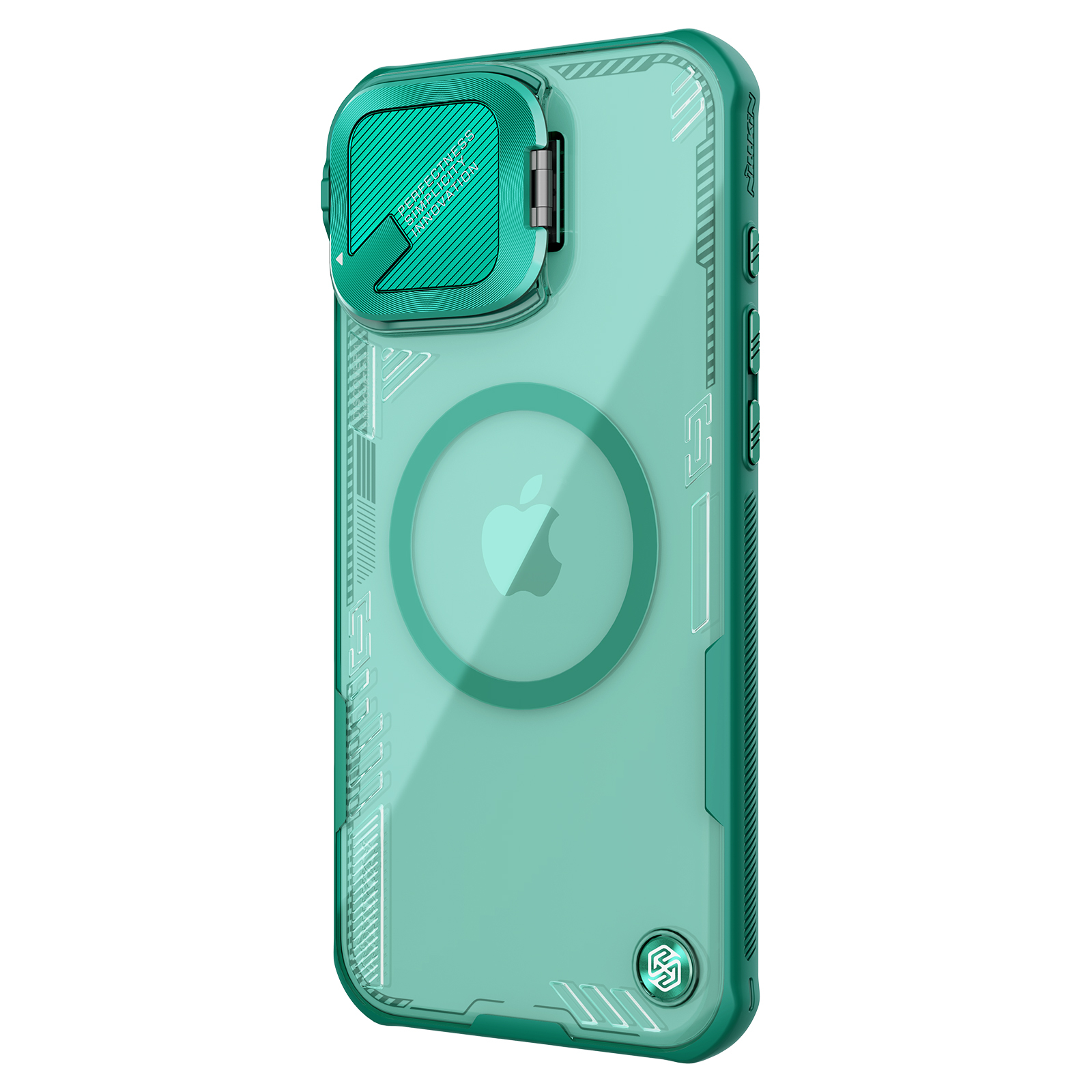 Противоударный чехол прозрачный зеленого цвета с металлической откидной крышкой и поддержкой магнитной беспроводной зарядки MagSafe от Nillkin серии Iceblade Prop Magnetic Case для телефона iPhone 16 создан для любителей активного отдыха.