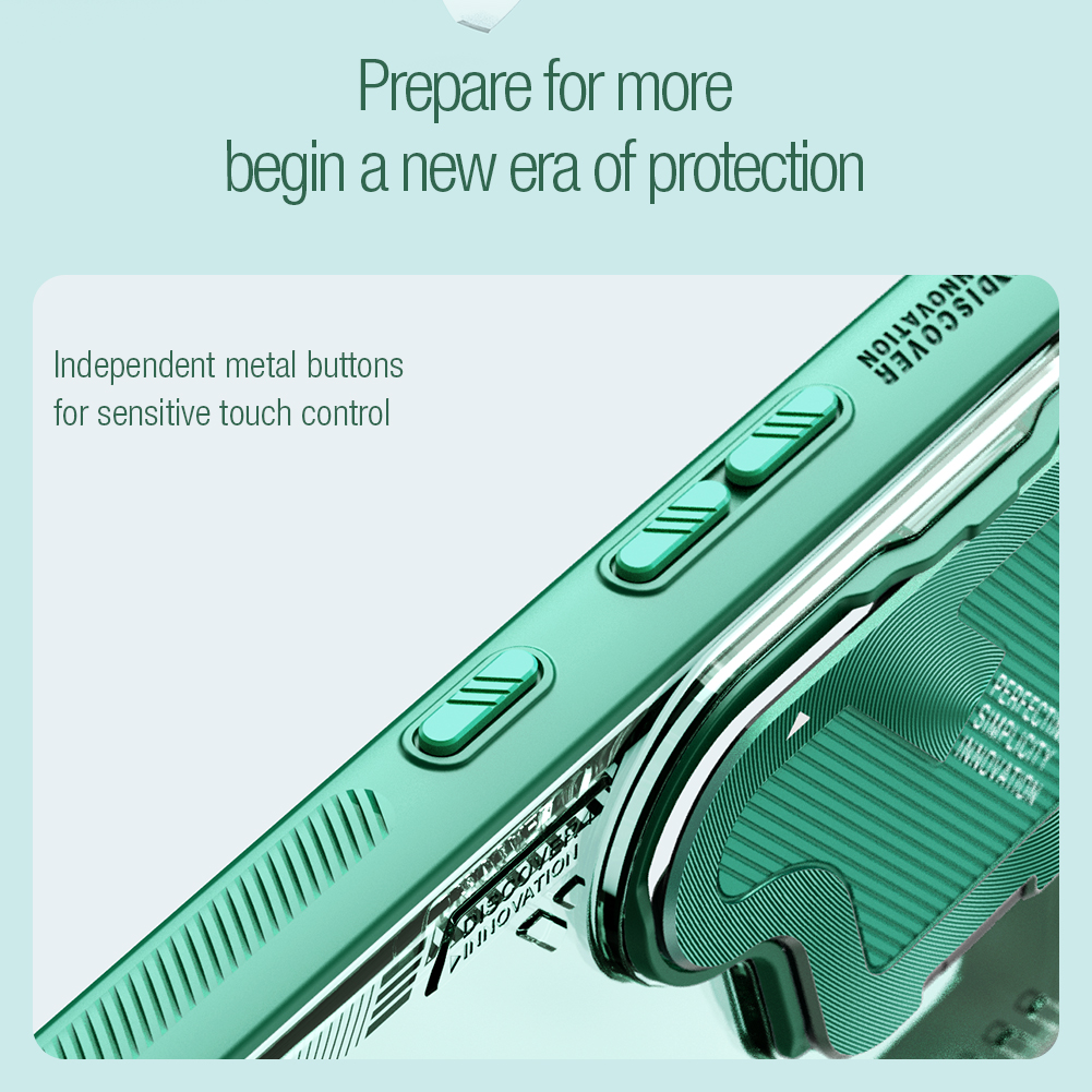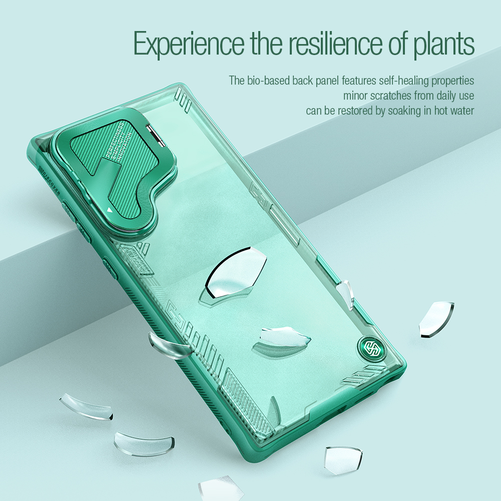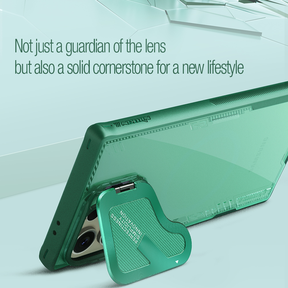 Противоударный чехол прозрачный зеленый (Glacier Green) с откидной металлической защитной крышкой для камеры от Nillkin серии Iceblade Prop Case для телефона Samsung Galaxy S24 Ultra создан для любителей активного отдыха.