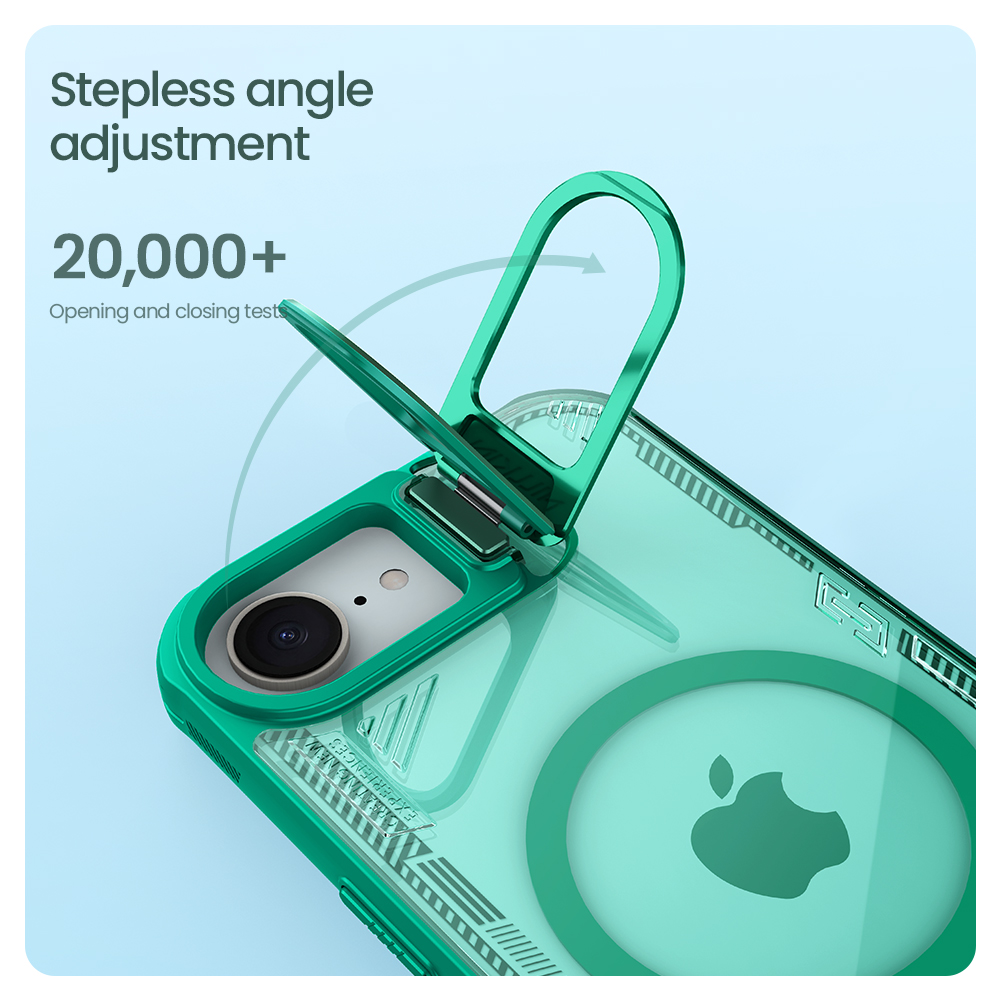 Противоударный чехол зеленого цвета с металлической откидной крышкой и поддержкой магнитной зарядки MagSafe от Nillkin серии Iceblade Prop Magnetic Case (Camera-visible Version) для телефона iPhone 16e создан для любителей активного отдыха.