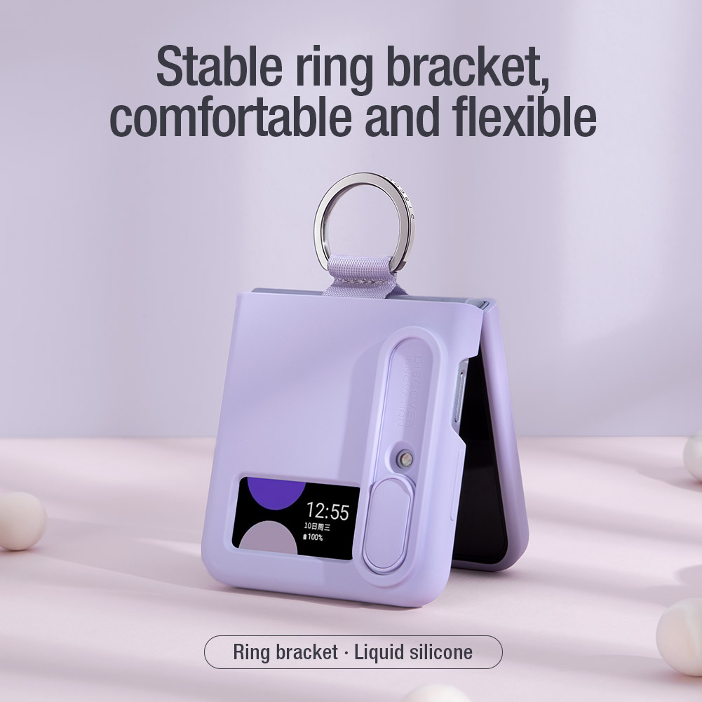 Противоскользящий чехол пурпурного цвета (Misty Purple) из шелковистого силикона с защитной крышкой задней камеры от Nillkin серии CamShield Silky Silicone для телефона Samsung Galaxy Z Flip 4 5G.