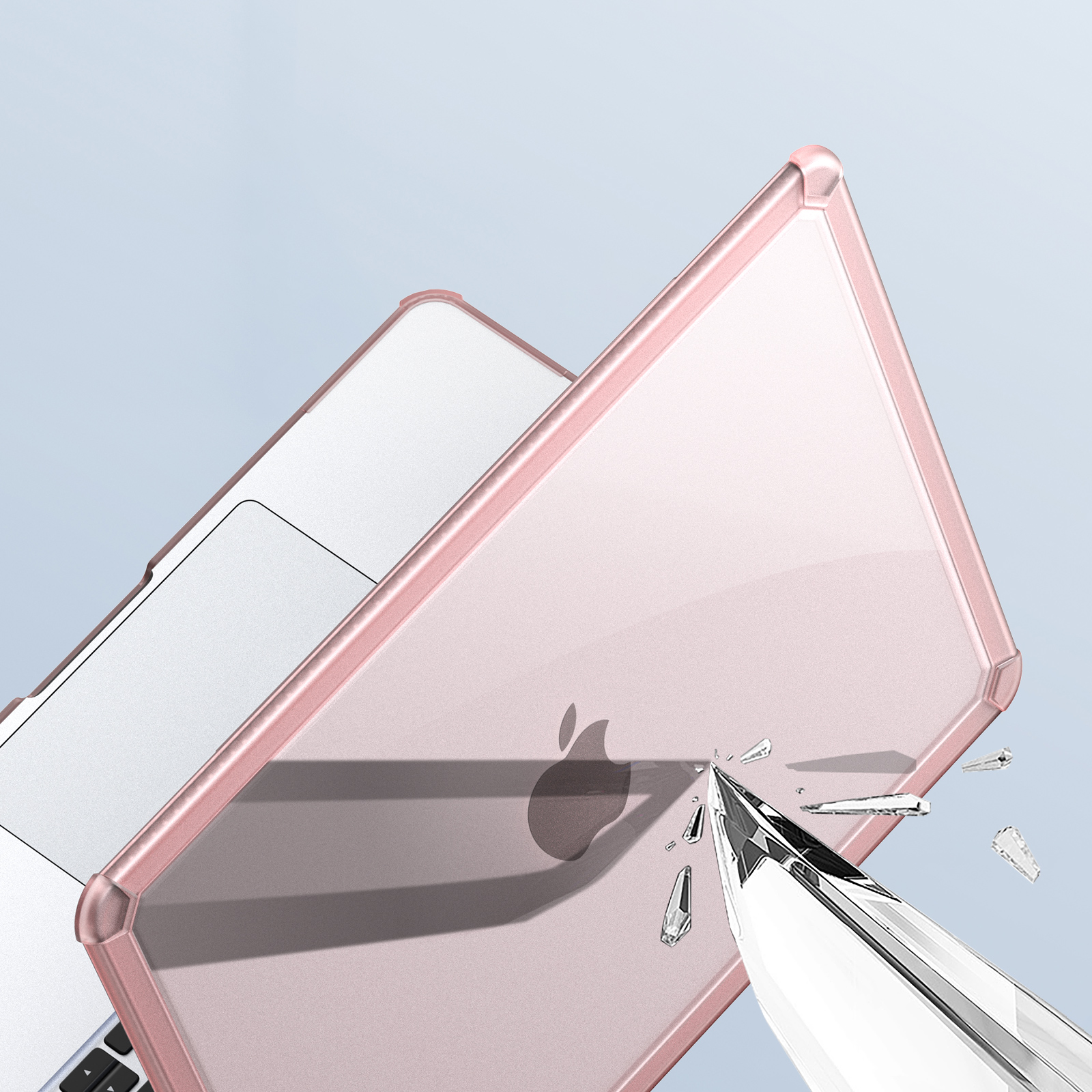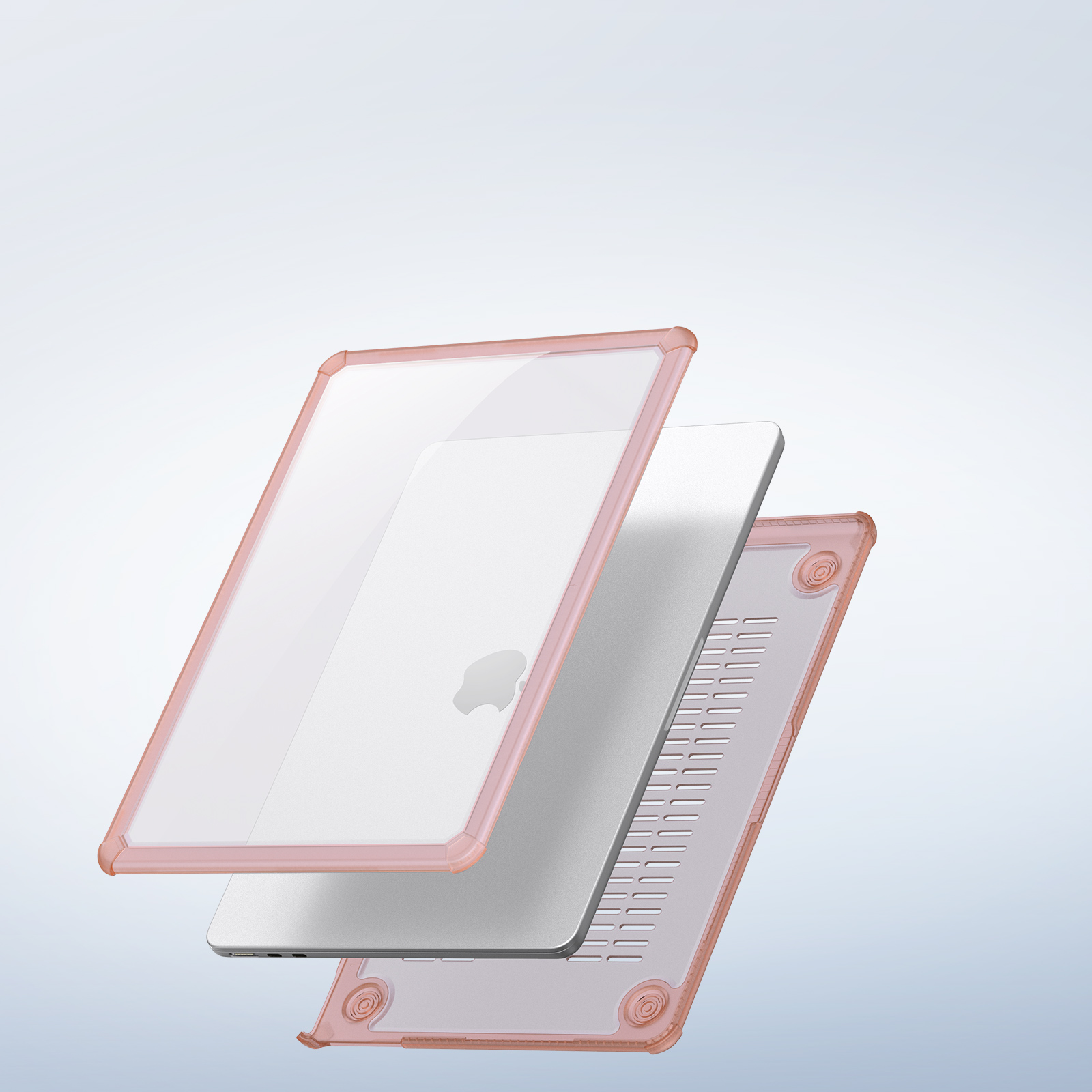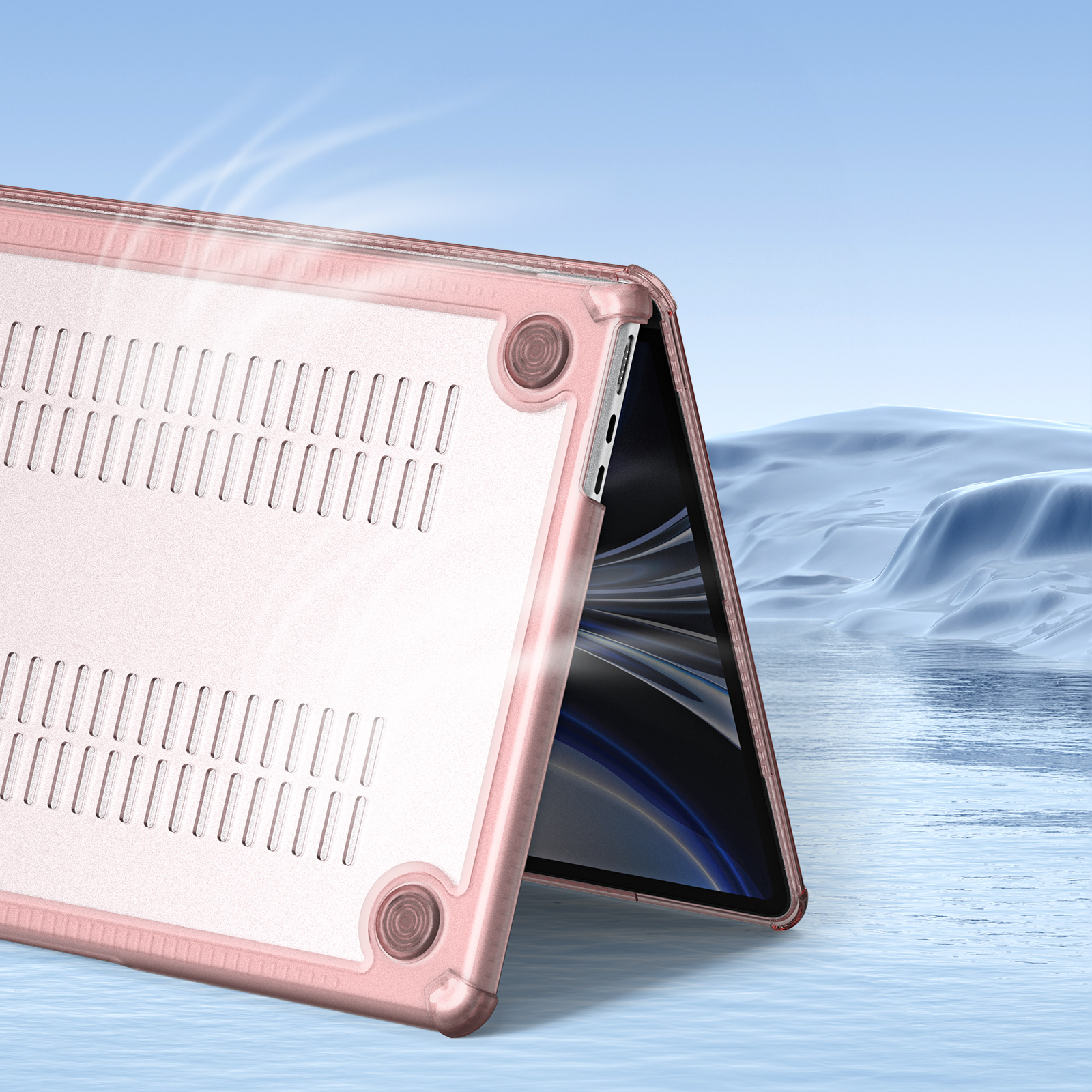 Середина выполнена из прозрачного поликарбонатного листа розового цвета, окруженного утолщенным жестким слоем из термопластичного полиуретана (TPU). Чехол обеспечивает всестороннюю защиту и устойчив к трещинам и царапинам. Матовая поверхность с олеофобным слоем предотвращает появление отпечатков пальцев и пятен, сохраняя ваш ноутбук MacBook Pro диагональю 13.3 выпуск 2016-2021г чистым как новый в течение длительного времени. Тепло легко отводится через вентиляционные отверстия, сохраняя MacBook прохладным.