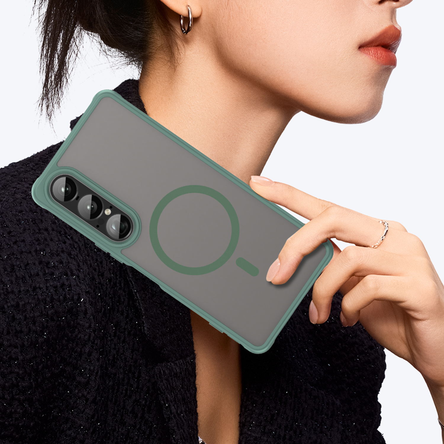 Противоударный чехол с поддержкой MagSafe и с усиленными боковыми рамками зеленого цвета для дисплея и матовый тонированной задней крышкой на телефон Sony Xperia 1 VII (1-7) от Caseport. Для зарядки смартфона необходимо использовать индукционный магнит MagSafe.