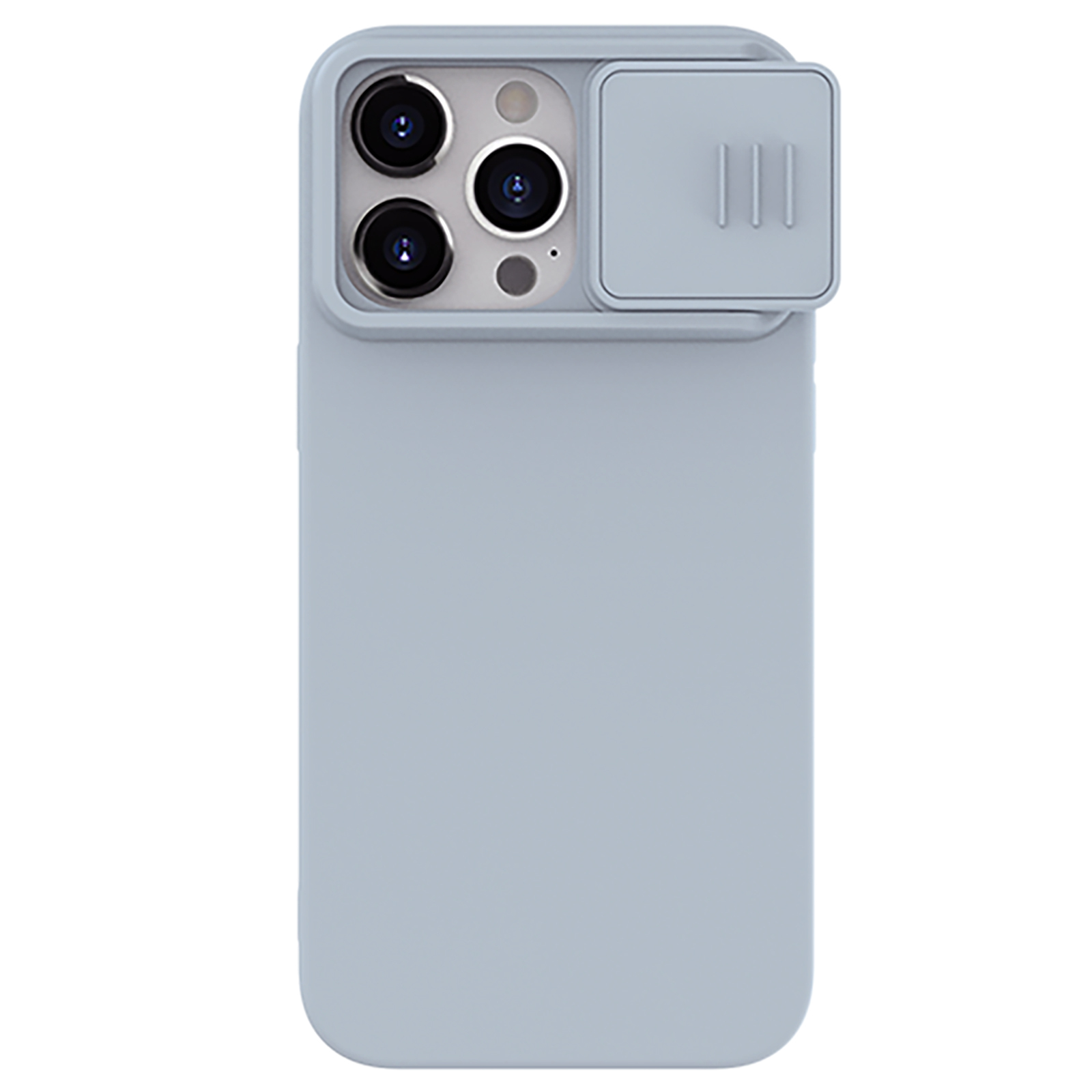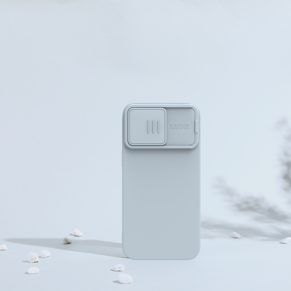 Противоскользящий чехол серого цвета (Star Grey) покрытый шелковистым силиконом с защитной шторкой задней камеры , а также встроенный в чехол магнит для использования зарядки MagSafe от Nillkin серии CamShield Silky Silicone для телефона iPhone 15 Pro Max.