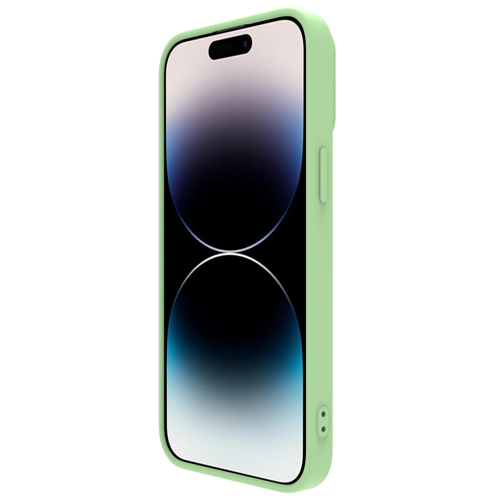 Противоскользящий чехол зеленого цвета (Mint Green) покрытый шелковистым силиконом с защитной шторкой задней камеры , а также встроенный в чехол магнит для использования зарядки MagSafe от Nillkin серии CamShield Silky Silicone для телефона iPhone 14 Pro.