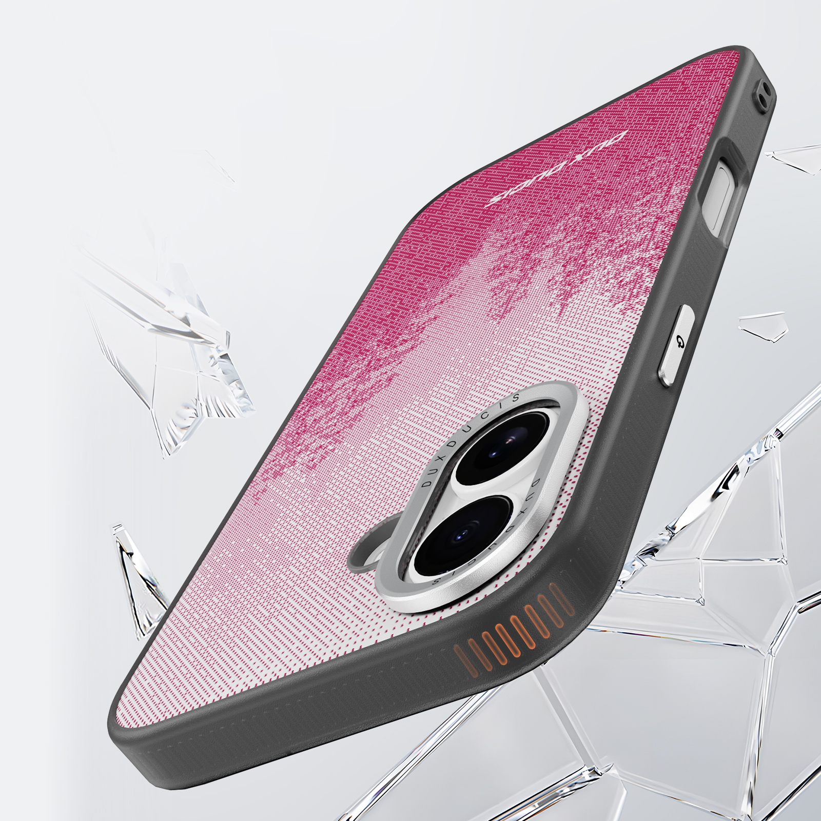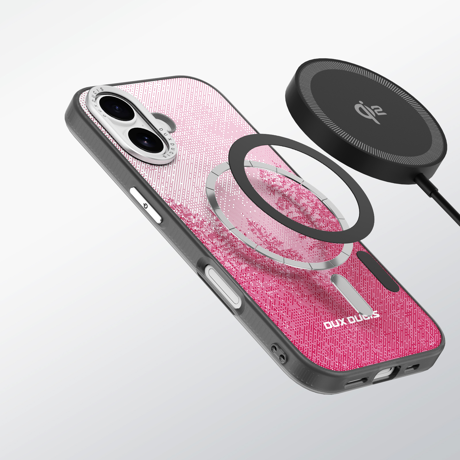 Чехол красного цвета с поддержкой беспроводной зарядки MagSage от Dux Ducis серии Moro Series Magnetic Case для смартфона iPhone 17. Текстурированный рисунок с УФ-печатью и высококачественная искусственная кожа для насыщенных визуальных и тактильных ощущений. Кнопки и кольцо камеры из алюминиевого сплава с ЧПУ-обработкой, устойчивые к износу и выцветанию.
