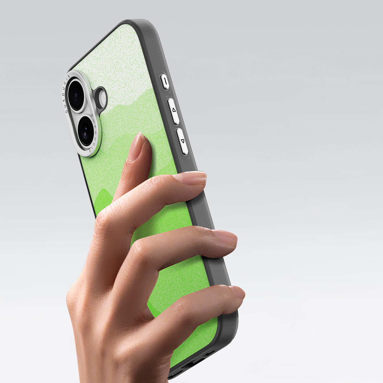 Чехол зеленого цвета с поддержкой беспроводной зарядки MagSage от Dux Ducis серии Moro Series Magnetic Case для смартфона iPhone 17. Текстурированный рисунок с УФ-печатью и высококачественная искусственная кожа для насыщенных визуальных и тактильных ощущений. Кнопки и кольцо камеры из алюминиевого сплава с ЧПУ-обработкой, устойчивые к износу и выцветанию.