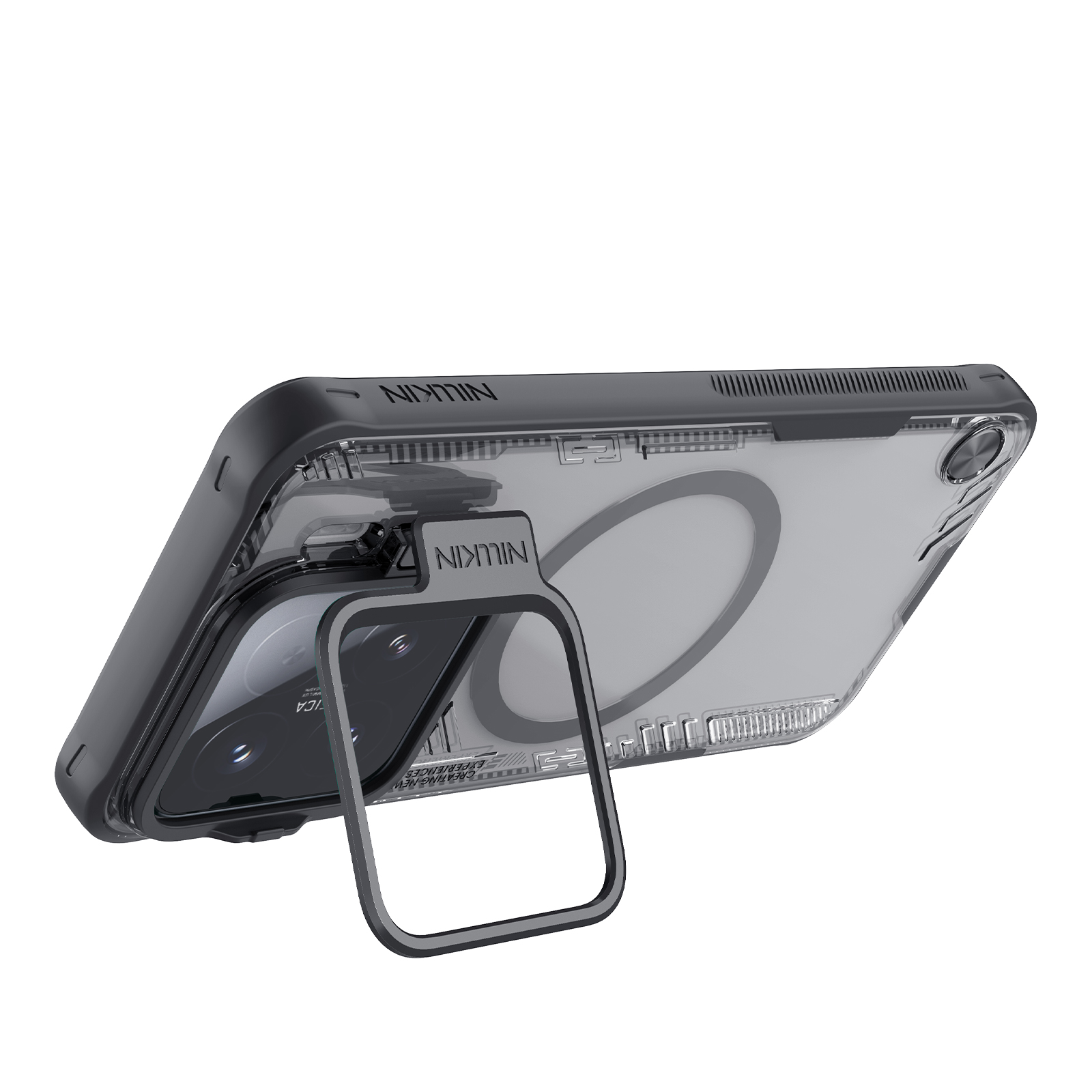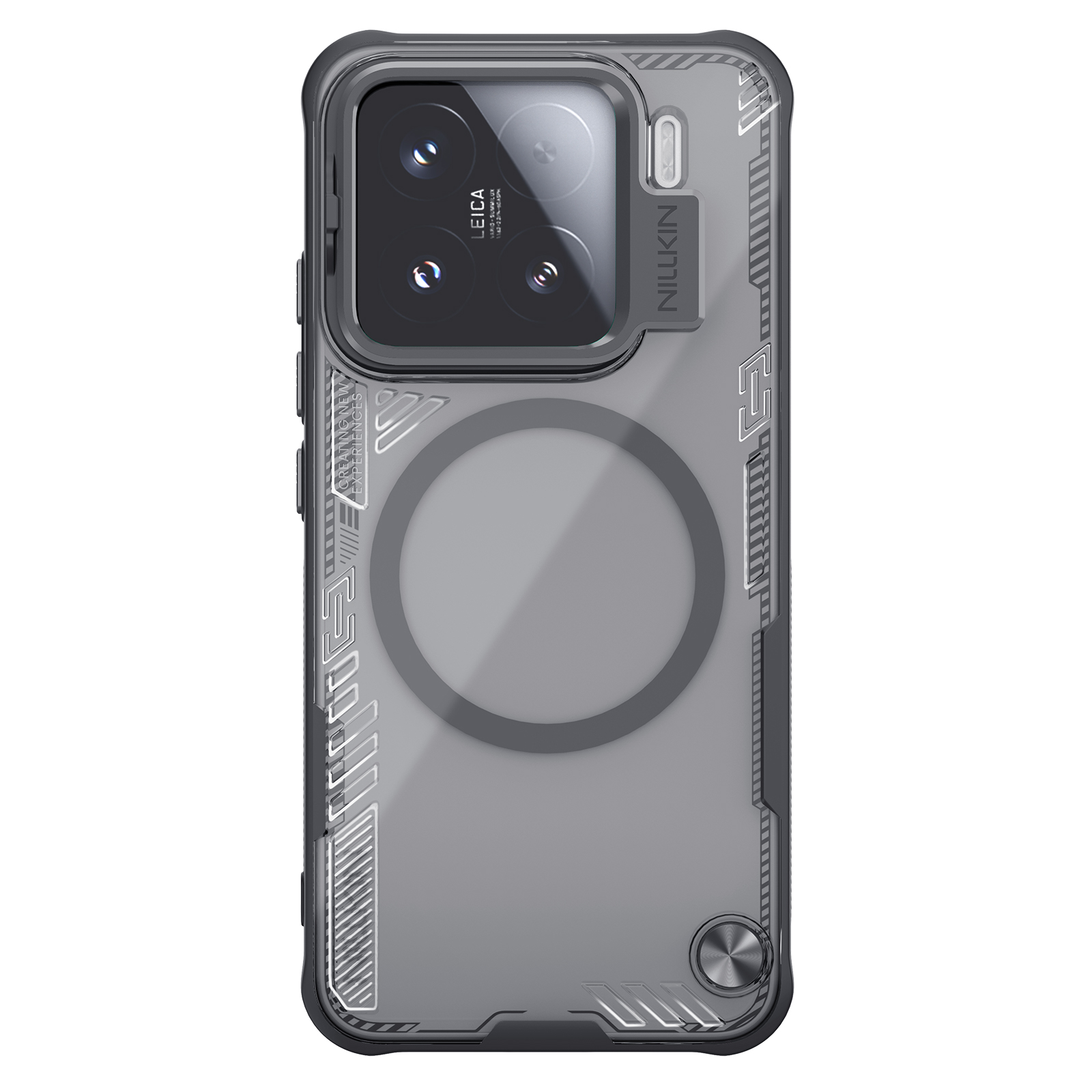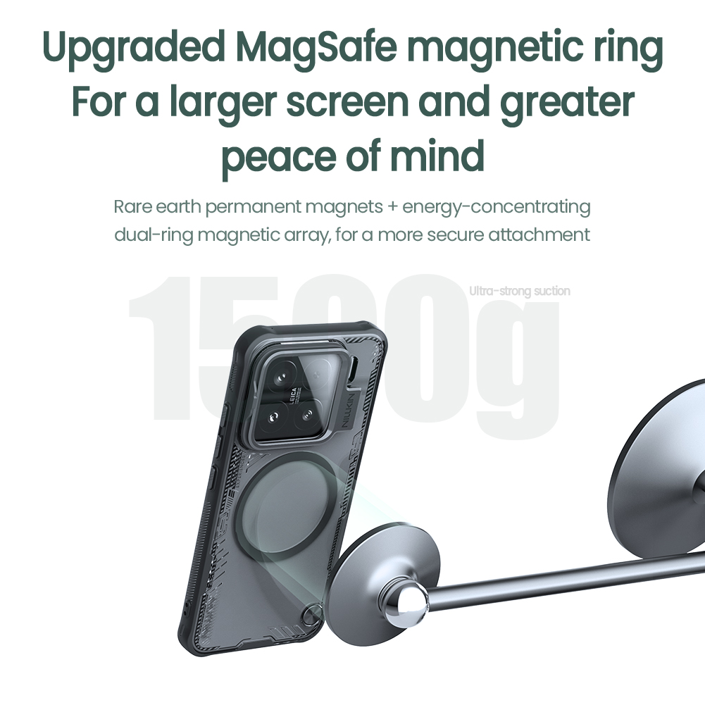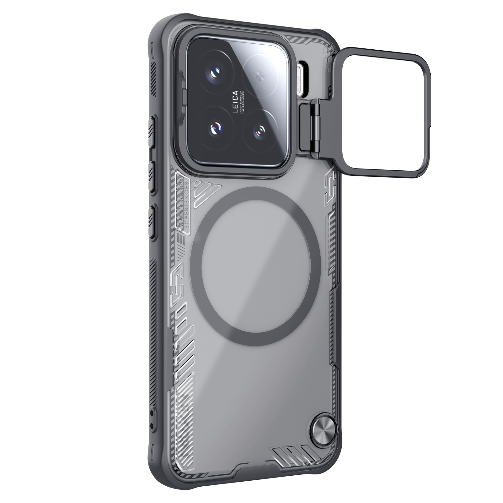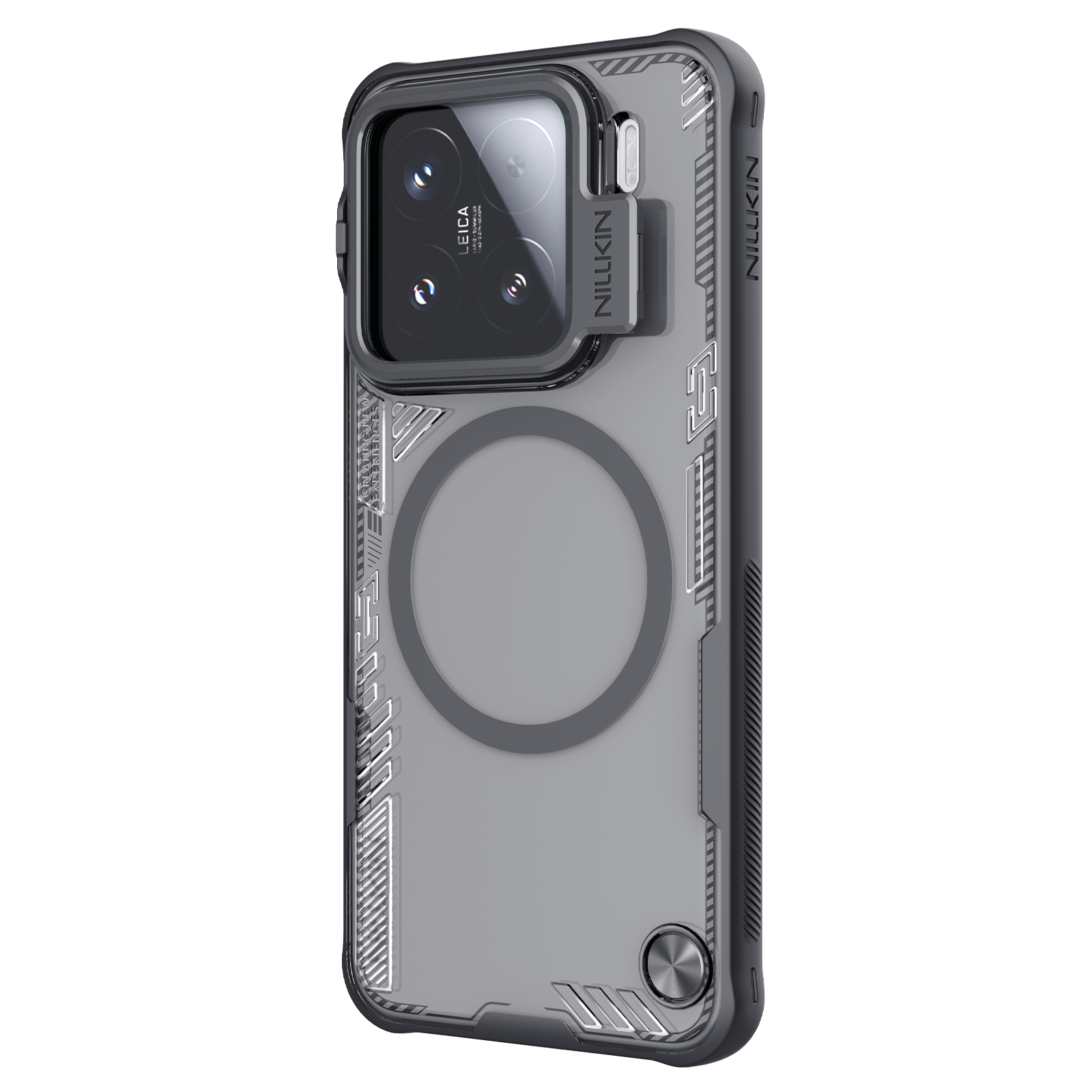 Противоударный чехол тонированный прозрачный с металлической откидной крышкой и поддержкой магнитной беспроводной зарядки MagSafe от Nillkin серии Iceblade Prop Magnetic (версия с открытой крышкой объектива) для телефона Xiaomi 15 создан для любителей активного отдыха.