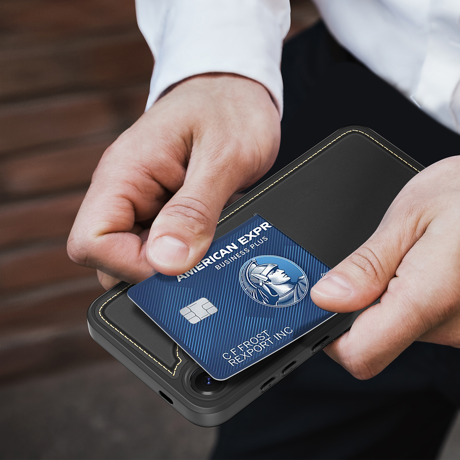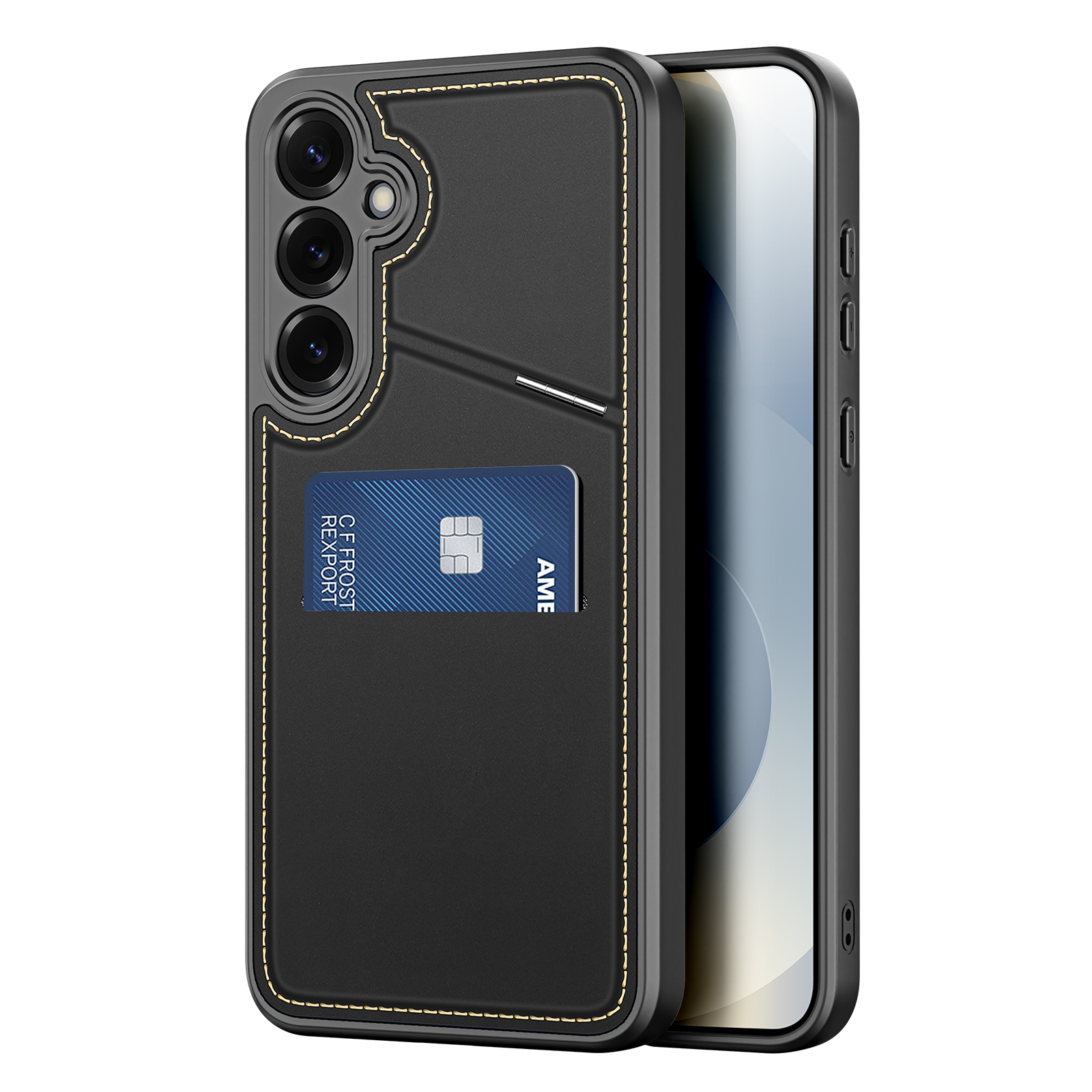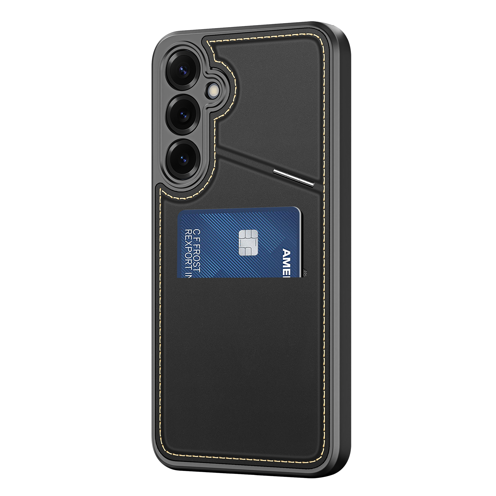 Чехол черного цвета с картхолдером и откидной подставкой от Dux Ducis для Samsung Galaxy S25+ Плюс, серия Rafi II Mag Series Case (версия с поддержкой MagSafe). Задняя часть этого чехла покрыта слоем гладкой кожи. Он имеет два держателя для карт, один снаружи и один внутри, внутренний имеет функцию защиты от кражи.
