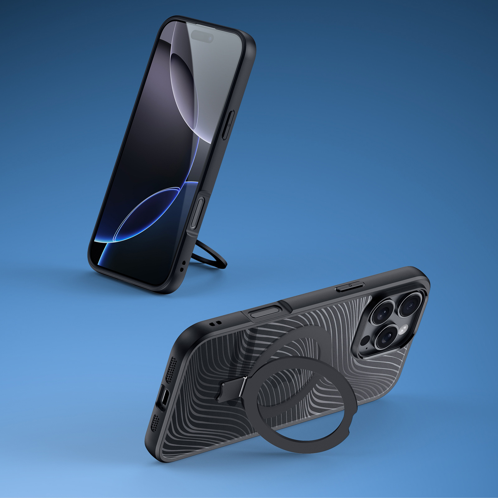 Тонкий чехол с поддержкой беспроводной зарядки MagSage от Dux Ducis серии Aimo Mag (версия с магнитной откидной подставкой) для смартфона iPhone 16 Pro Max изготавливается из экологичных материалов путем высокоточного литья под давление с высокой температурой.