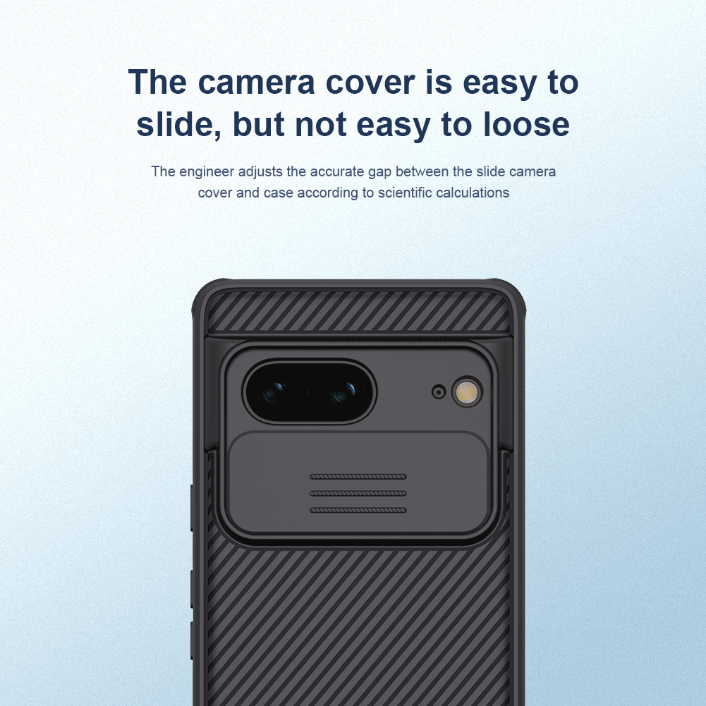 Противоударный чехол черного цвета с защитной шторкой задней камеры от Nillkin серии CamShield Pro Case для телефона Google Pixel 7 создан для любителей активного отдыха.