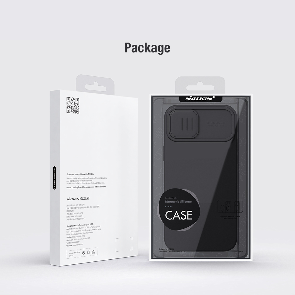 Противоскользящий чехол черного цвета покрытый шелковистым силиконом с защитной шторкой задней камеры , а также встроенный в чехол магнит для использования зарядки MagSafe от Nillkin серии CamShield Silky Silicone для телефона iPhone 14 и 13.