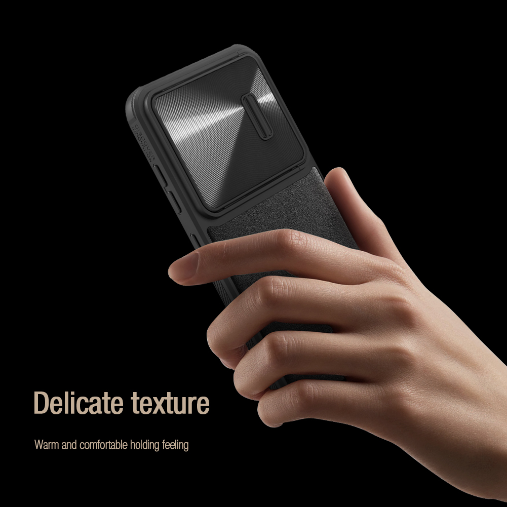 Противоударный чехол черного цвета с полуавтоматической защитной шторкой задней камеры от Nillkin серии CamShield Leather Case S для телефона Samsung Galaxy S23+ Плюс создан для любителей активного отдыха.