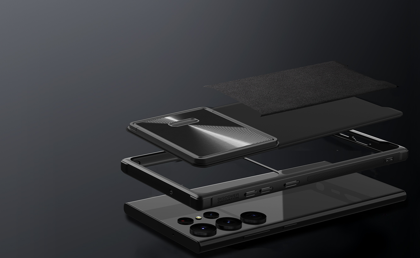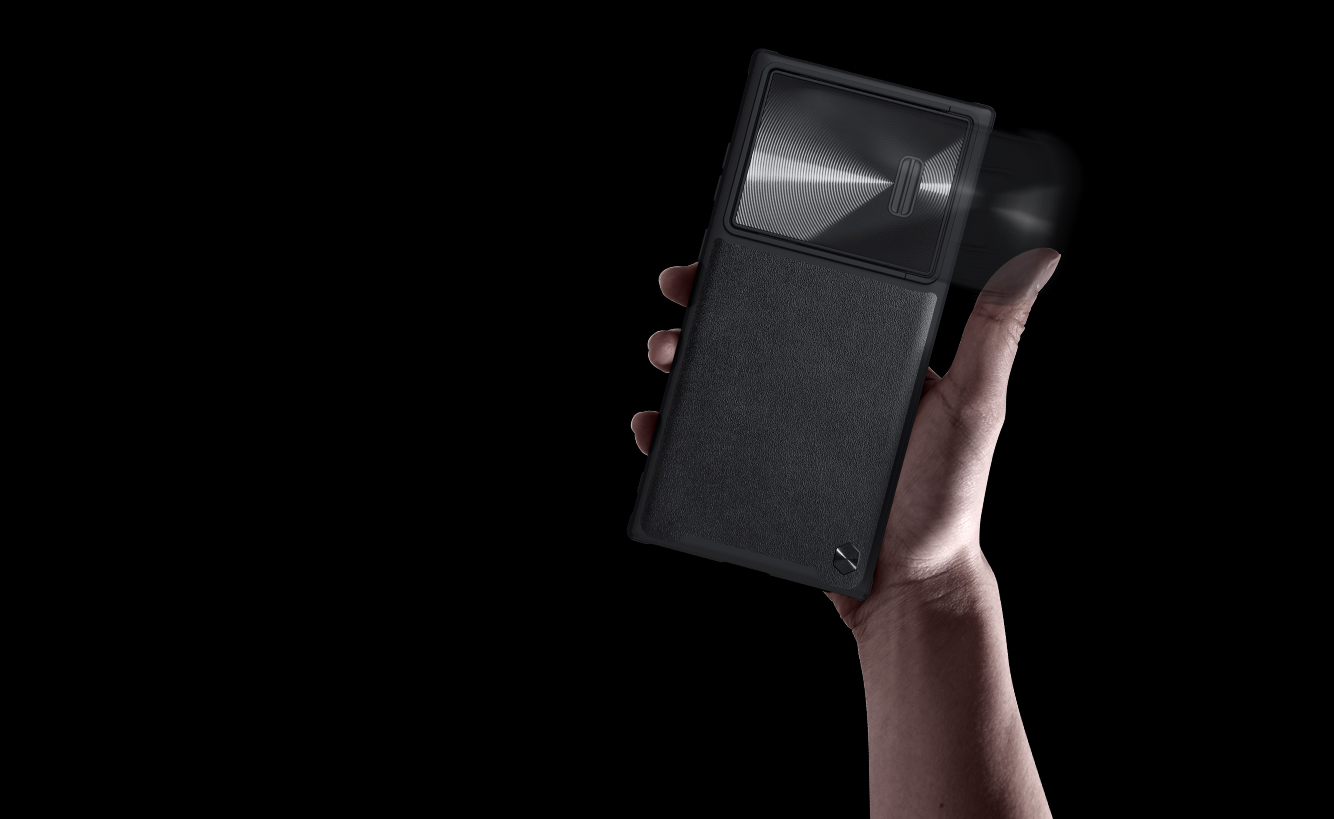 Противоударный чехол черного цвета с полуавтоматической защитной шторкой задней камеры от Nillkin серии CamShield Leather Case S для телефона Samsung Galaxy S23 Ultra создан для любителей активного отдыха.