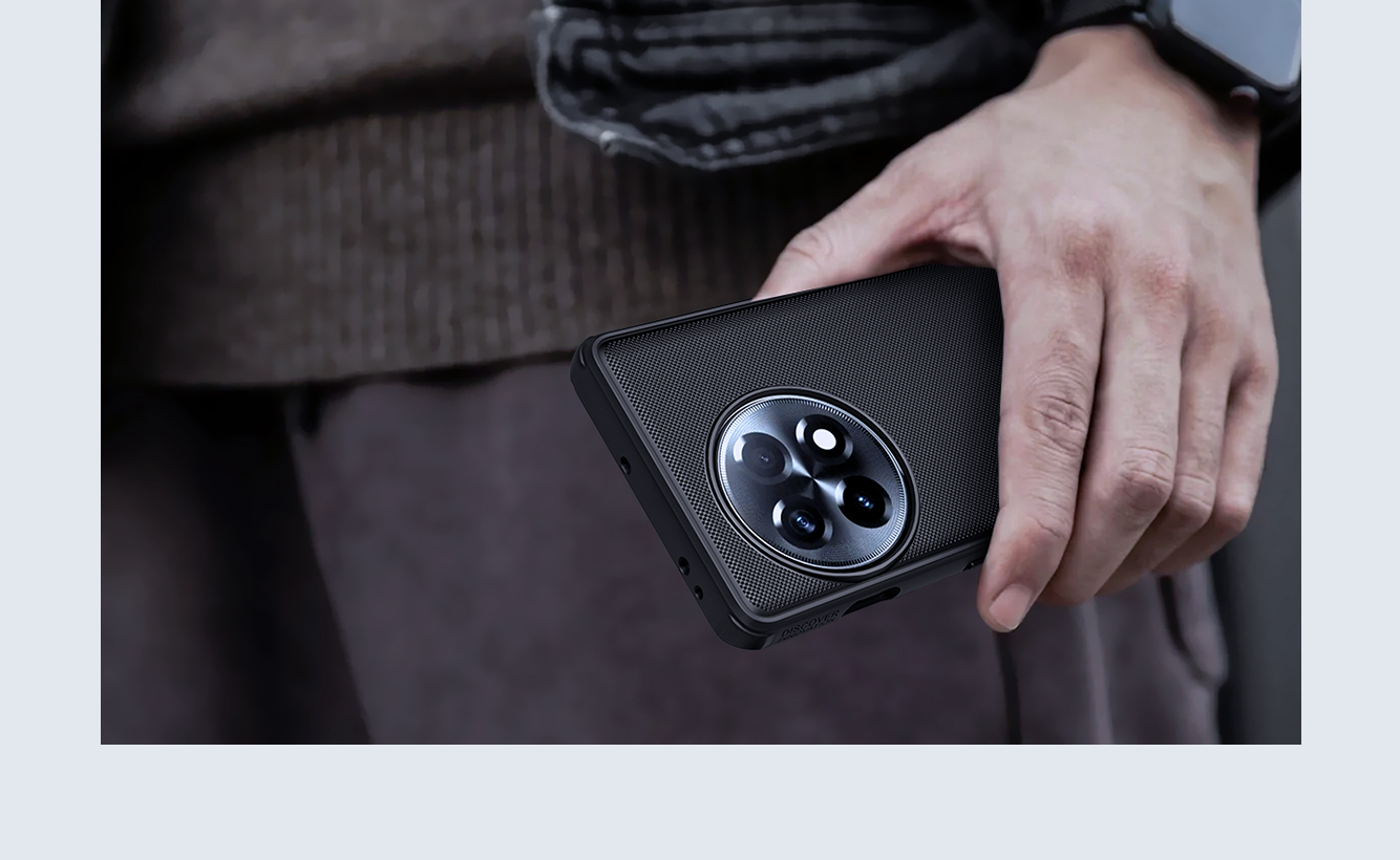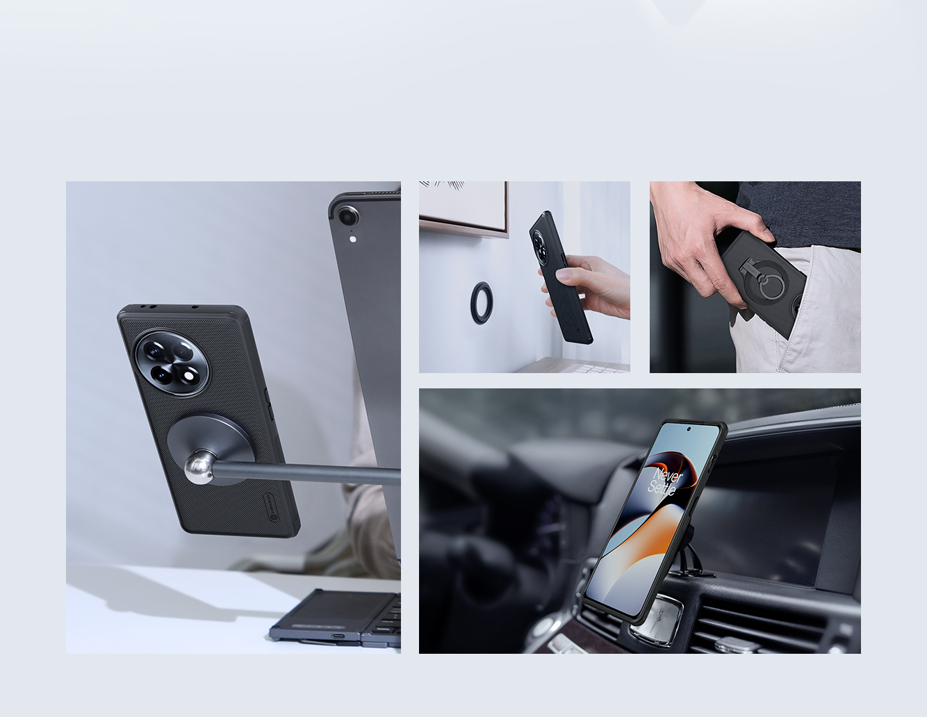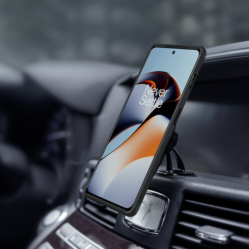 Защитный чехол черного цвета от Nillkin серии Super Frosted Shield Pro Magnetic для смартфона OnePlus Ace 2 и 11R с усиленными боковыми рамками по четырем углам и встроенным магнитом, изготавливается из экологичных материалов PC и TPU путем высокоточного литья под давление с высокой температурой.