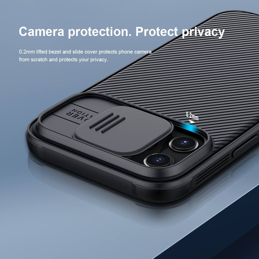 Противоударный чехол с защитной крышкой задней камеры от Nillkin серии CamShield Pro Case для iPhone 12 Pro Max создан для любителей активного отдыха.