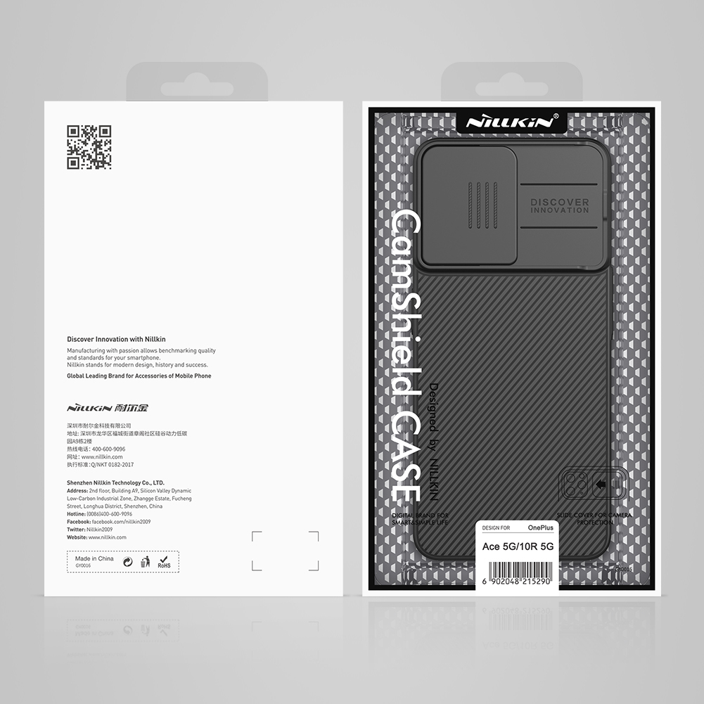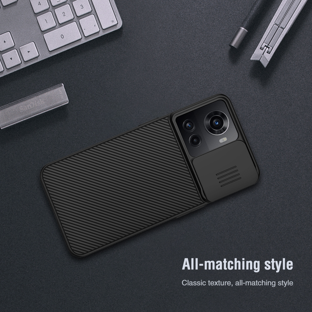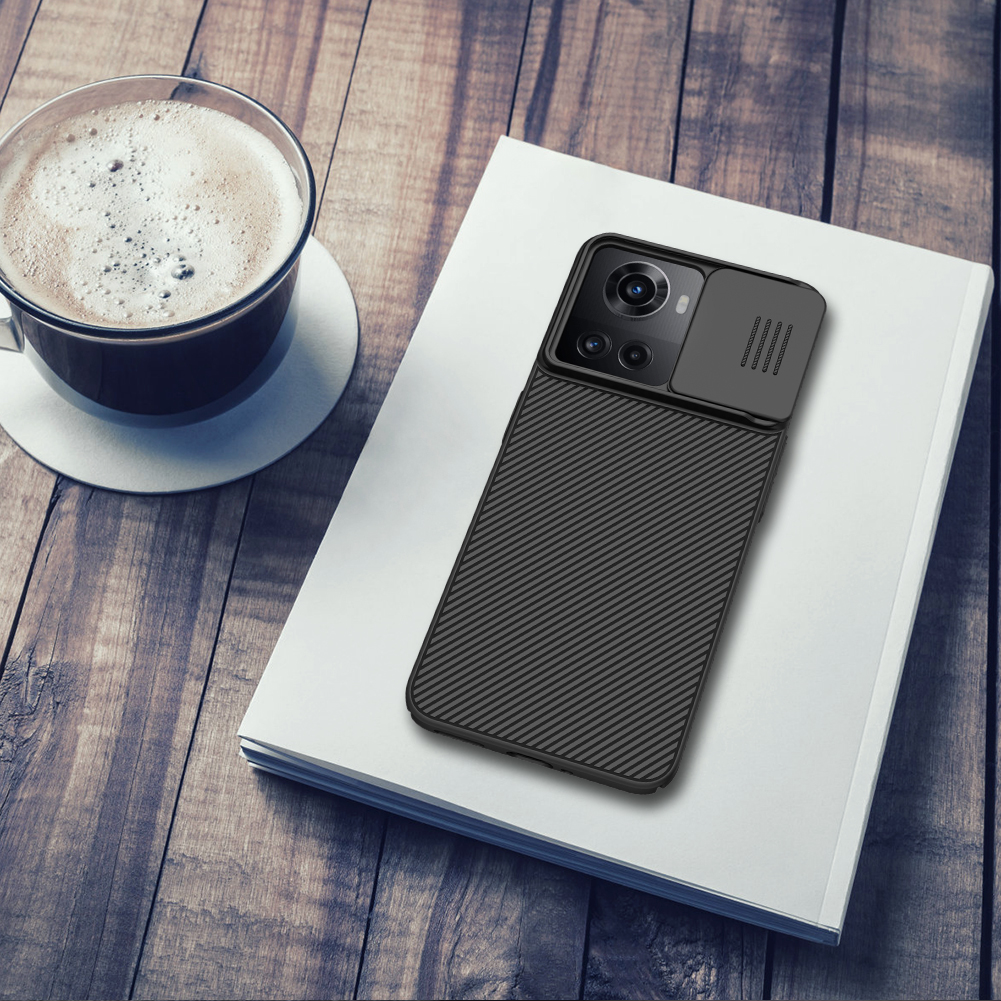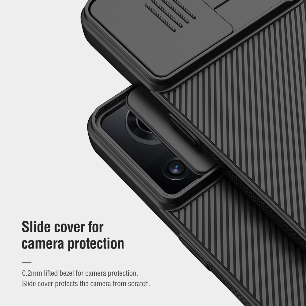Противоударный чехол черного цвета с защитной крышкой задней камеры серии CamShield Case от Nillkin для телефона OnePlus Ace 5G и 10R 5G, создан для любителей активного отдыха.