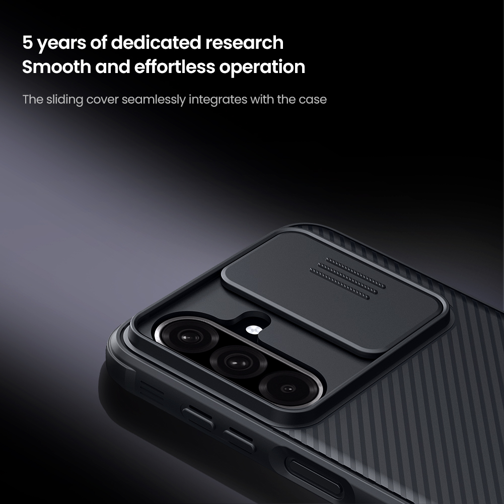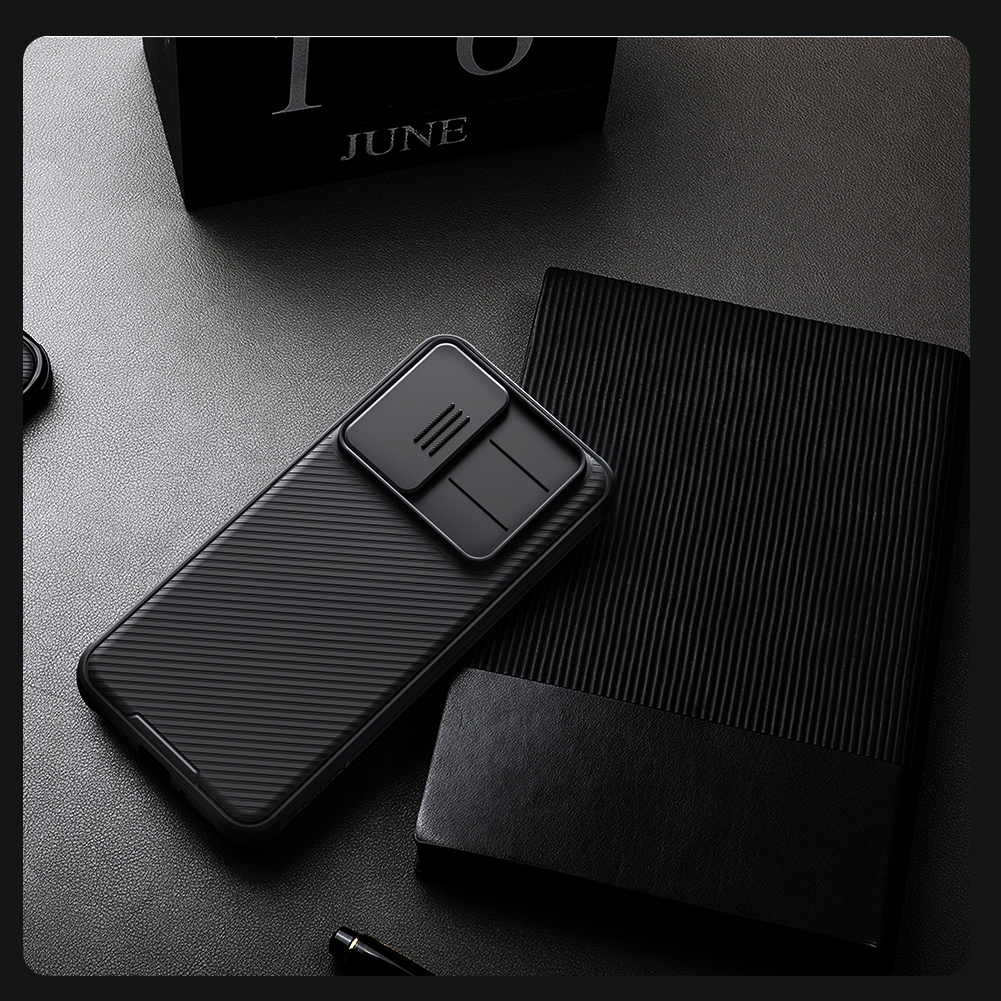 Противоударный чехол черного цвета с защитной шторкой задней камеры от Nillkin серии CamShield Pro Case для телефона Samsung Galaxy A26 5G создан для любителей активного отдыха.