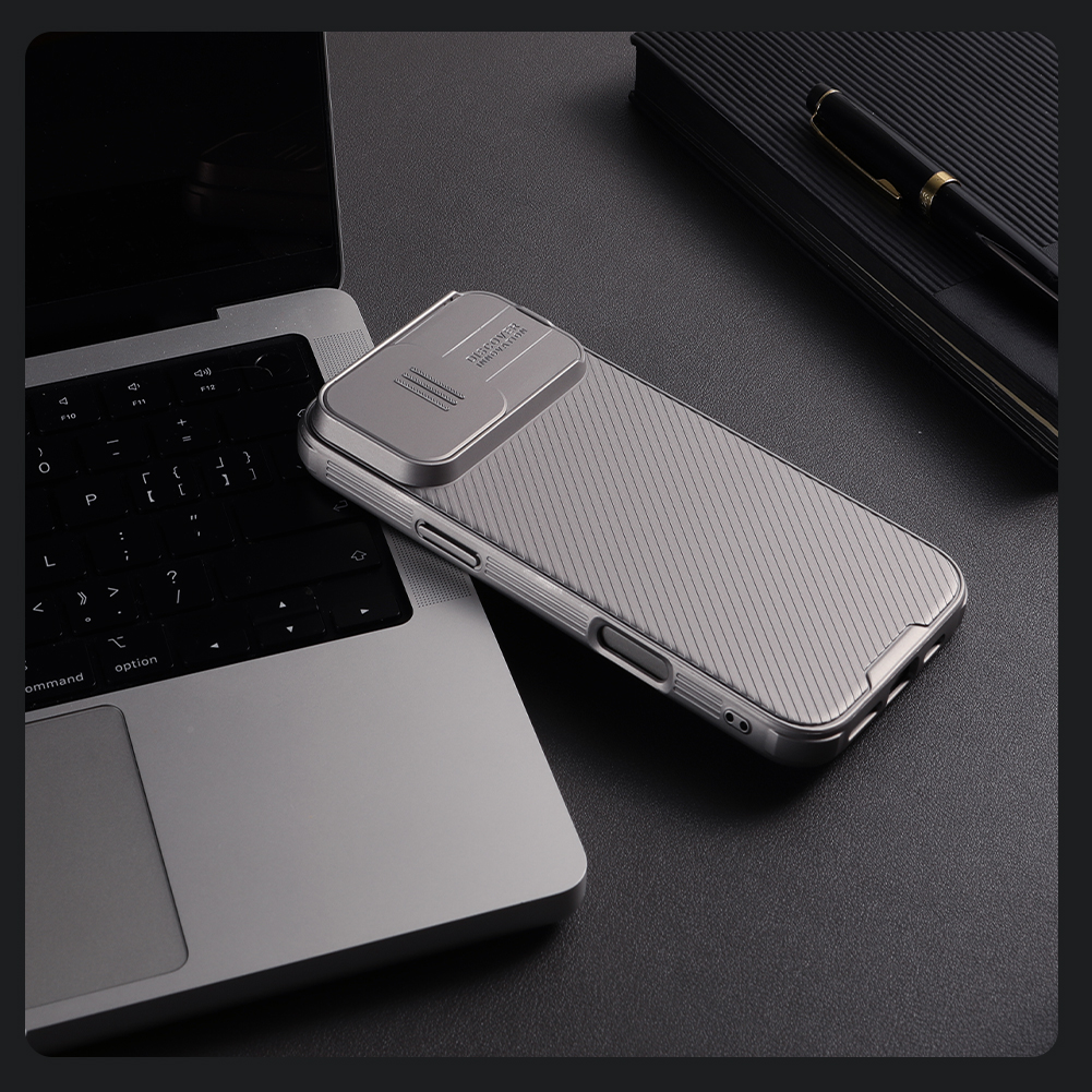 Противоударный чехол серого цвета (Titanium Gray) с защитной шторкой задней камеры от Nillkin серии CamShield Pro Case для телефона iPhone 16 Pro Max создан для любителей активного отдыха.