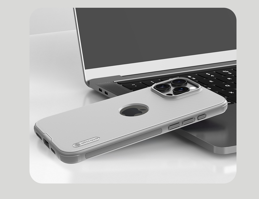 Защитный чехол серого цвета (Titanium Gray) от Nillkin серии Super Frosted Shield (версия с вырезом под лого) для смартфона iPhone 16 Pro с усиленными боковыми рамками по четырем углам, изготавливается из экологичных материалов PC и TPU путем высокоточного литья под давление с высокой температурой.