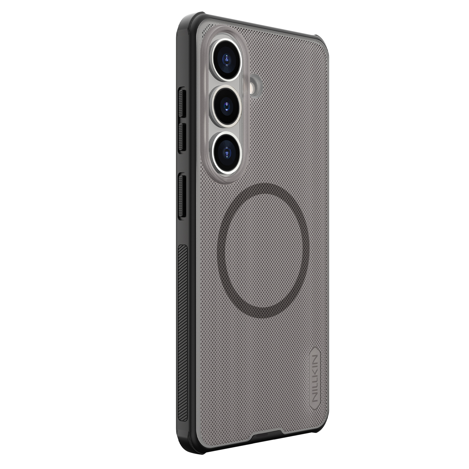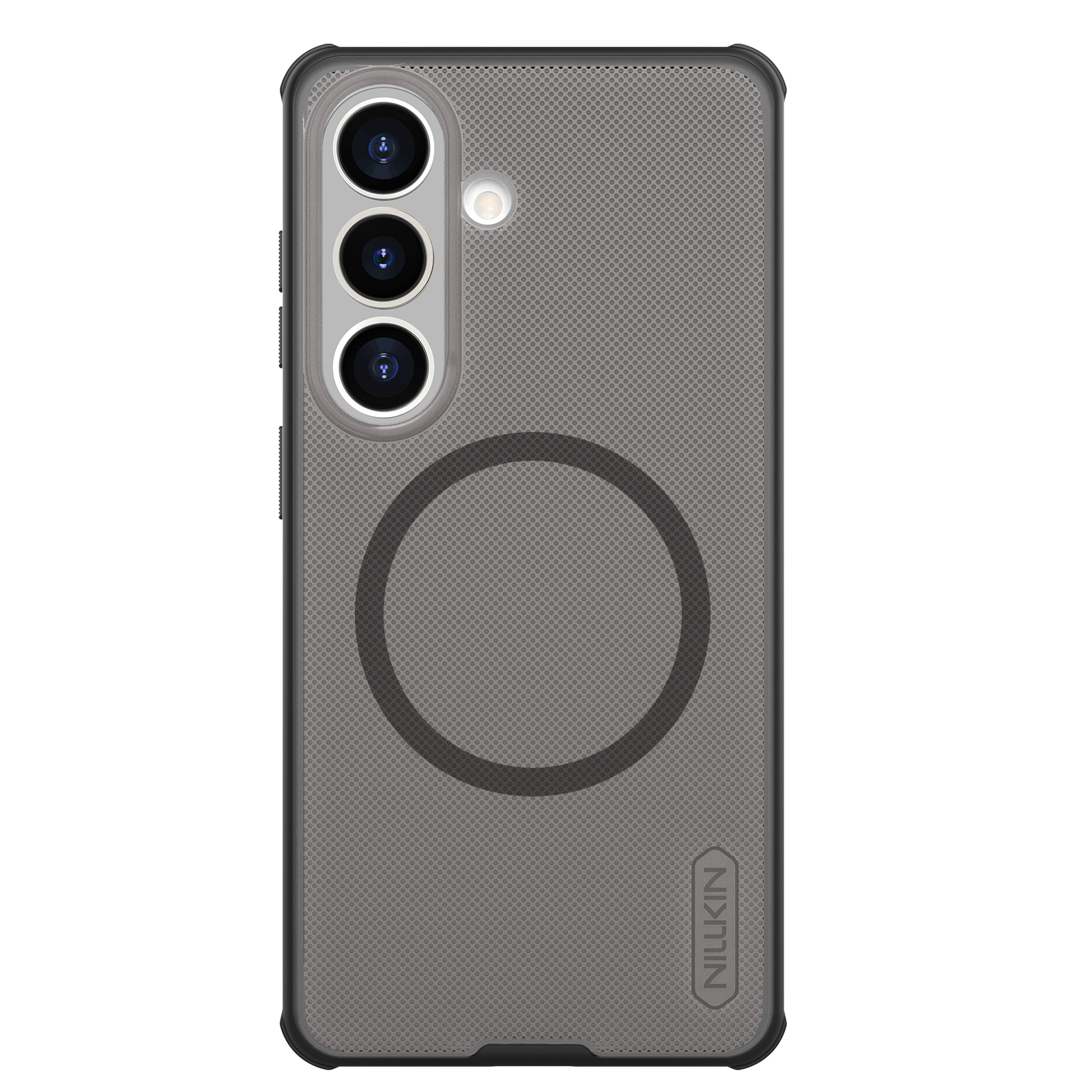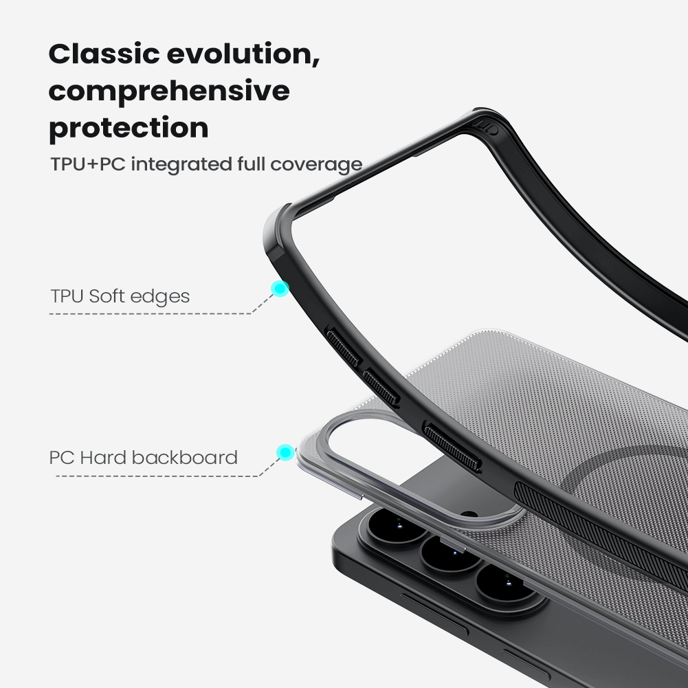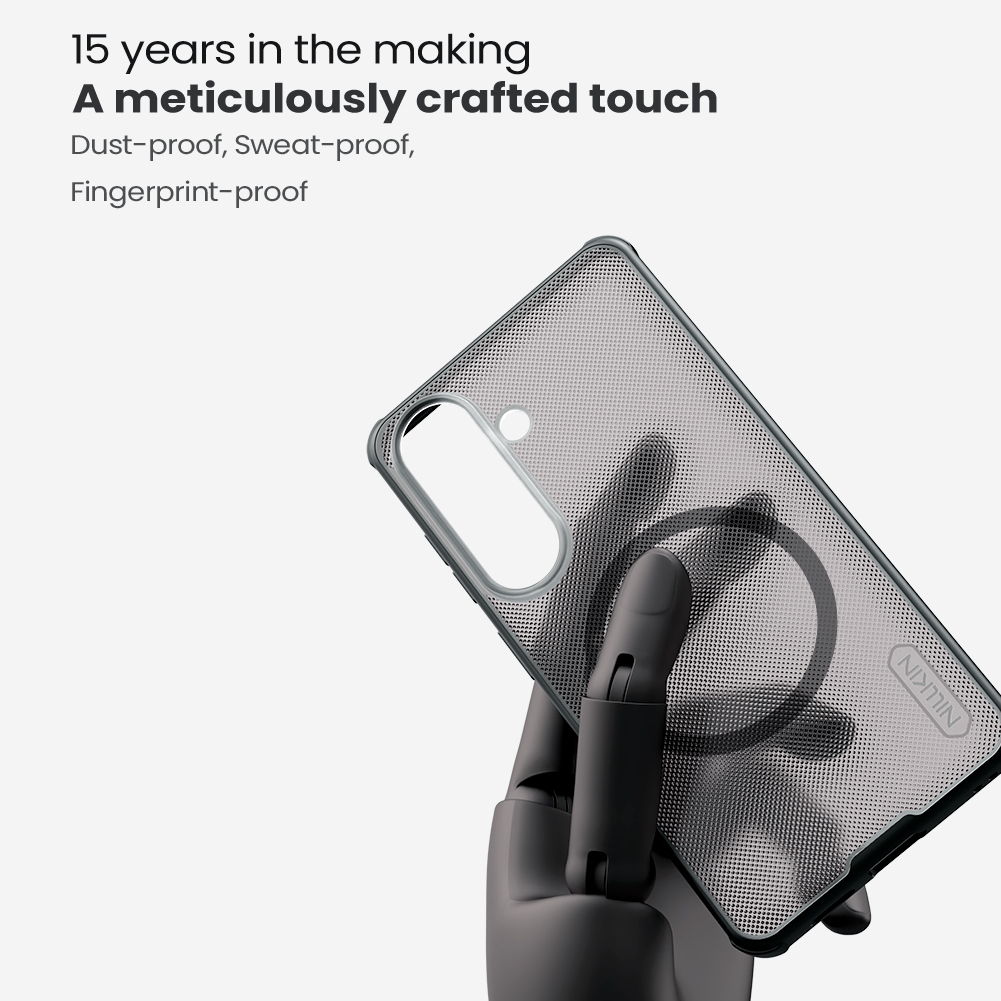 Защитный чехол прозрачный тонированный (Transparent black) от Nillkin серии Super Frosted Shield Pro Magnetic (Clear version) для смартфона Samsung Galaxy S26 с усиленными боковыми рамками по четырем углам и поддержкой зарядки MagSafe, изготавливается из экологичных материалов PC и TPU путем высокоточного литья под давление с высокой температурой.