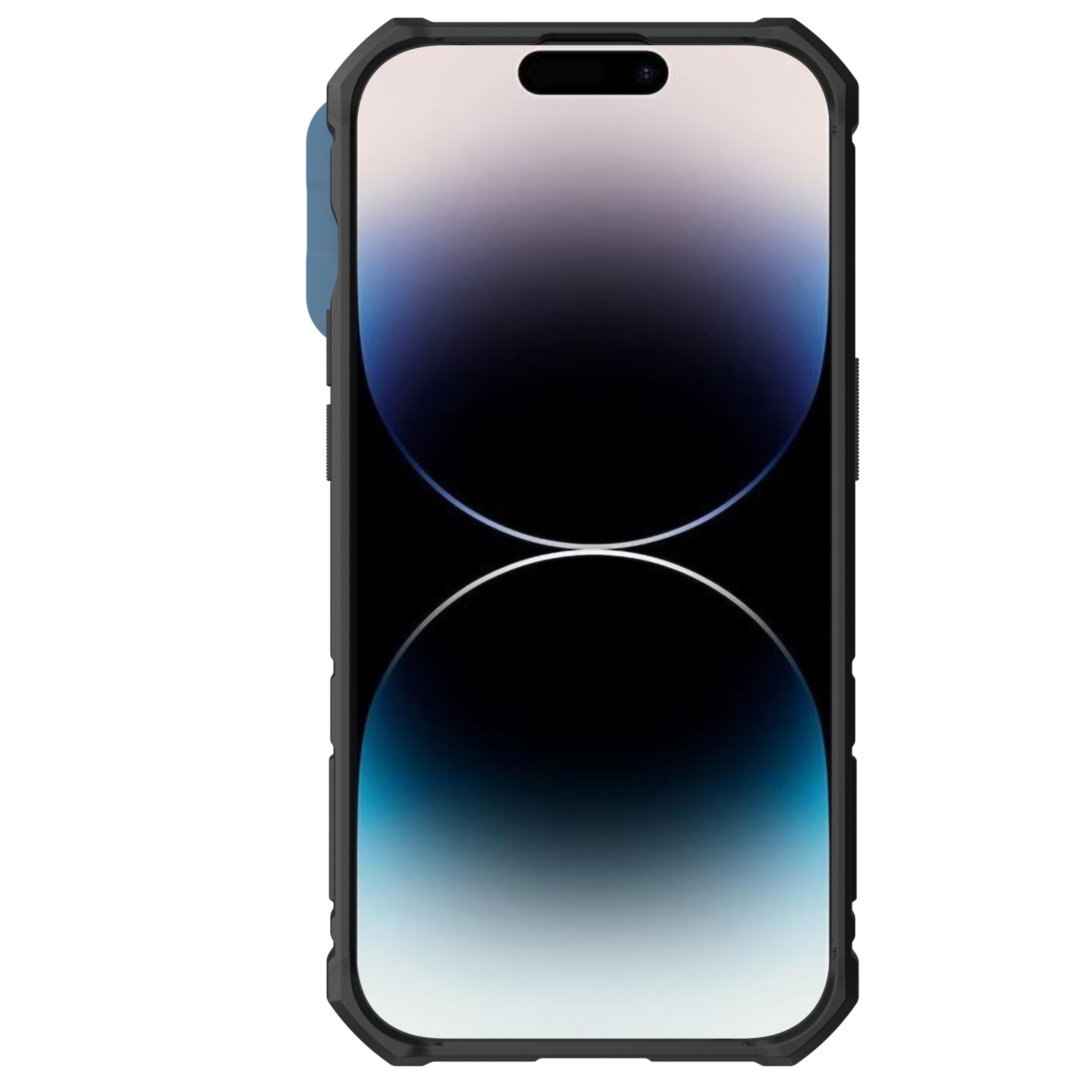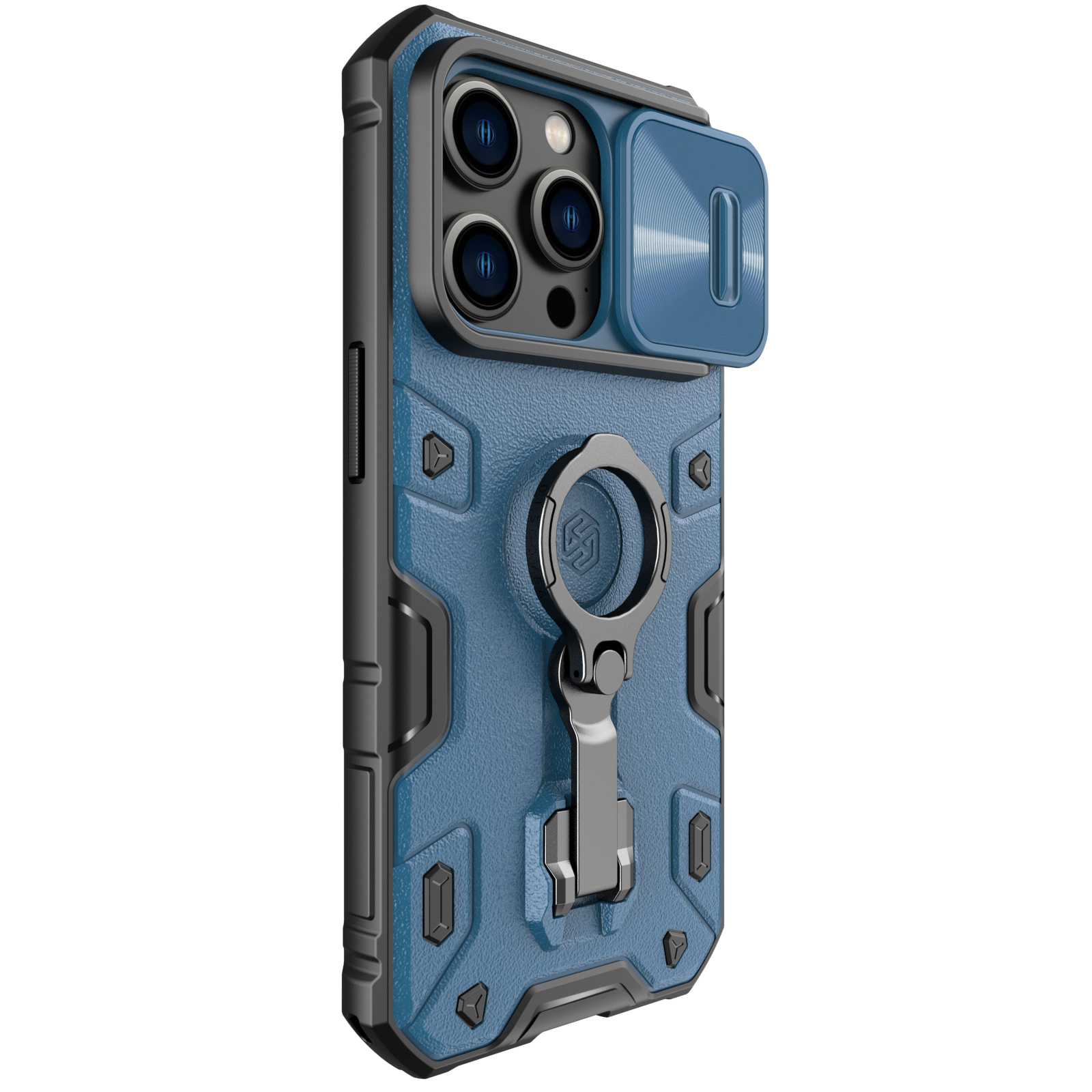 Противоударный чехол синего цвета с поворотным кольцом на 360 градусов и металлической защитной крышкой для задней камеры от Nillkin серии CamShield Armor Pro Case для телефона iPhone 14 Pro создан для любителей активного отдыха.