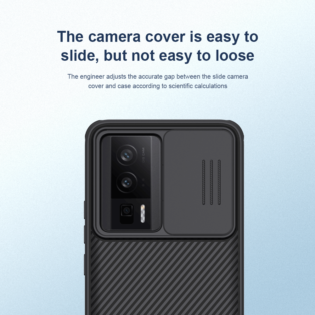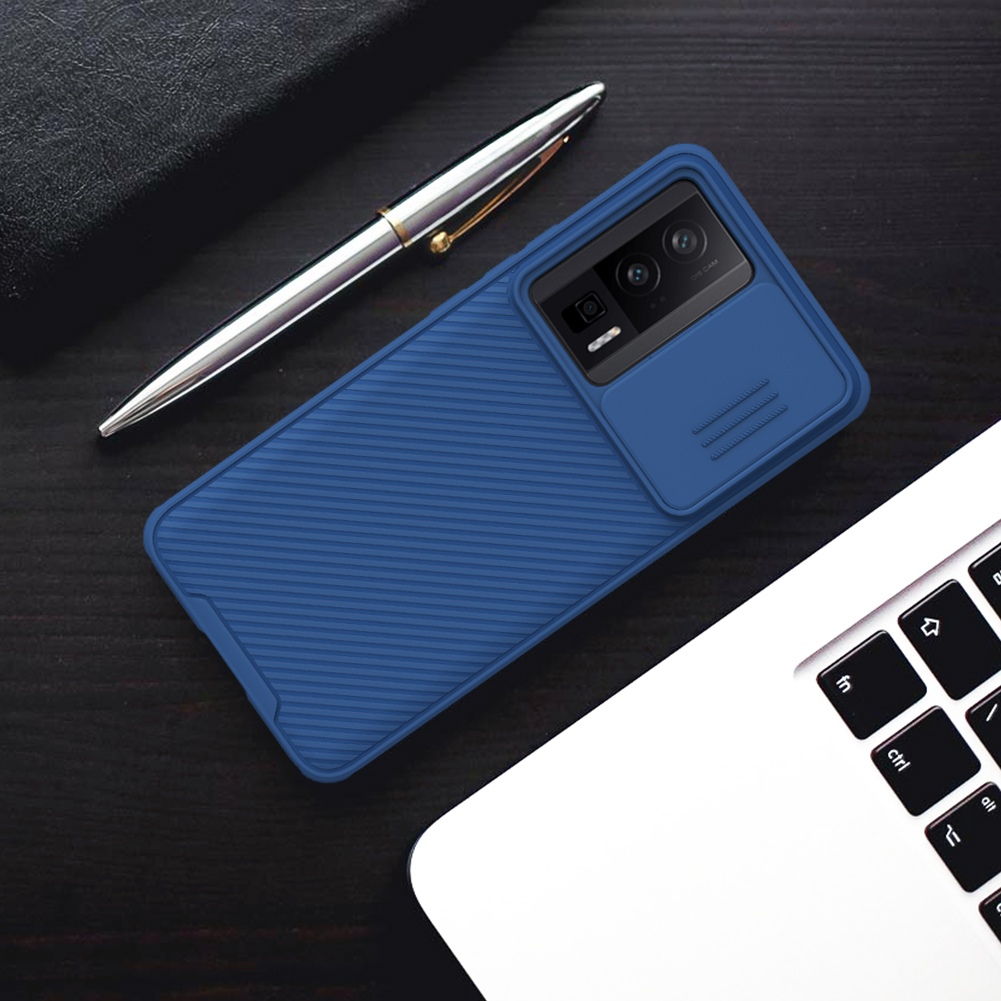 Противоударный чехол синего цвета с защитной шторкой задней камеры от Nillkin серии CamShield Pro Case для телефона Xiaomi Poco F5 Pro (Redmi K60, K60 Pro) создан для любителей активного отдыха.