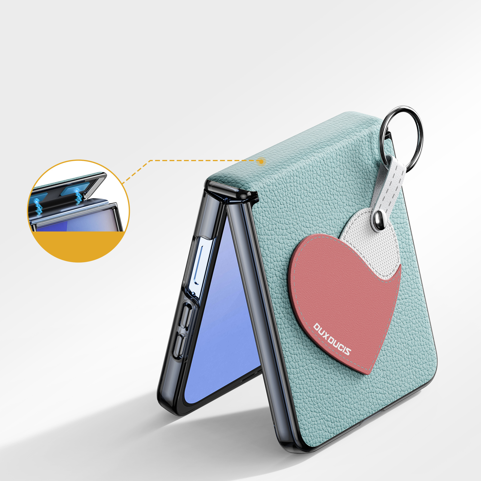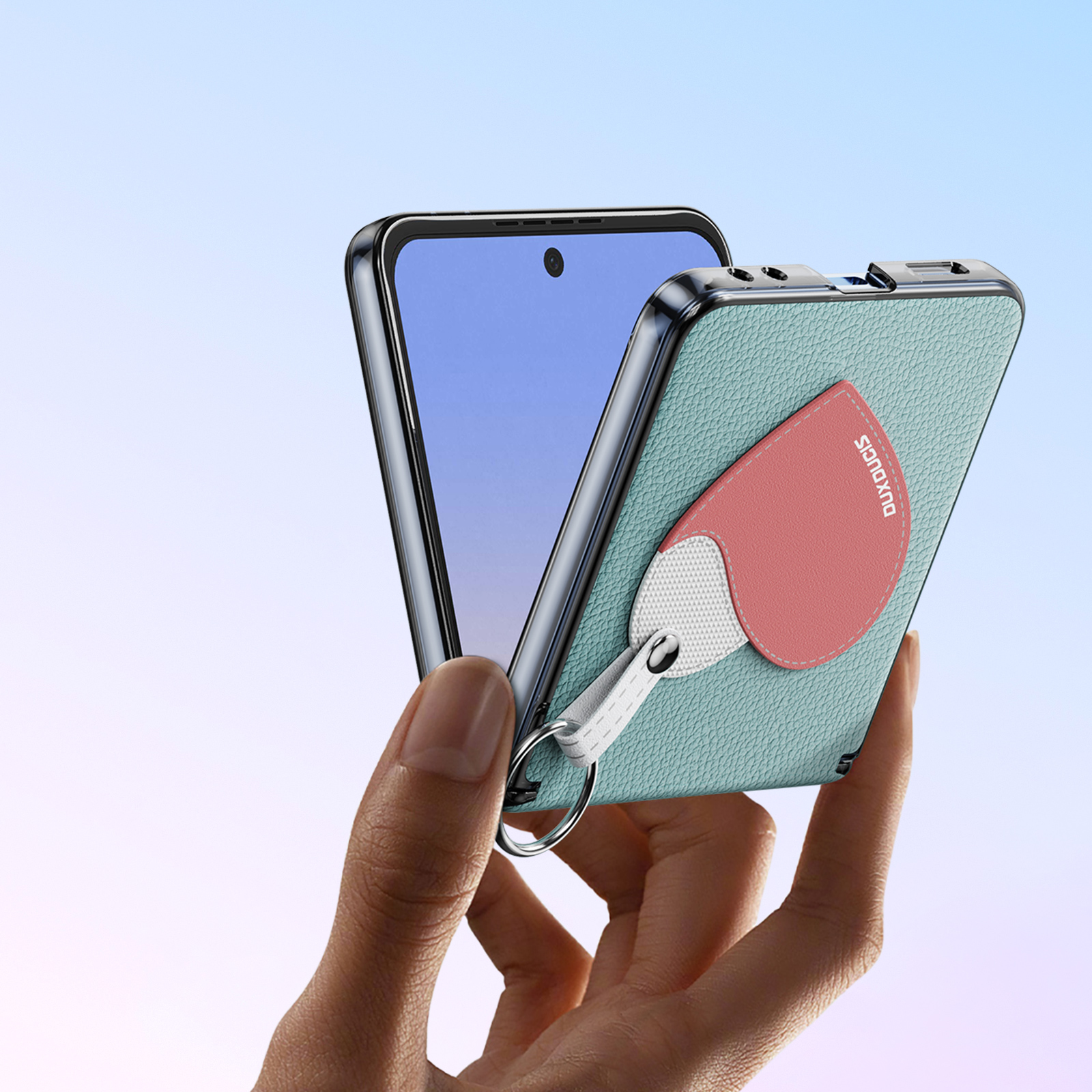 Складной чехол-кольцо из искусственной кожи синего цвета (Love Edition) серии Luvy для Samsung Z Flip7. Встроенный металлический ремешок с кольцом - надёжный захват одной рукой, предотвращающий падение; в комплект входит ремешок с защитой от потери.