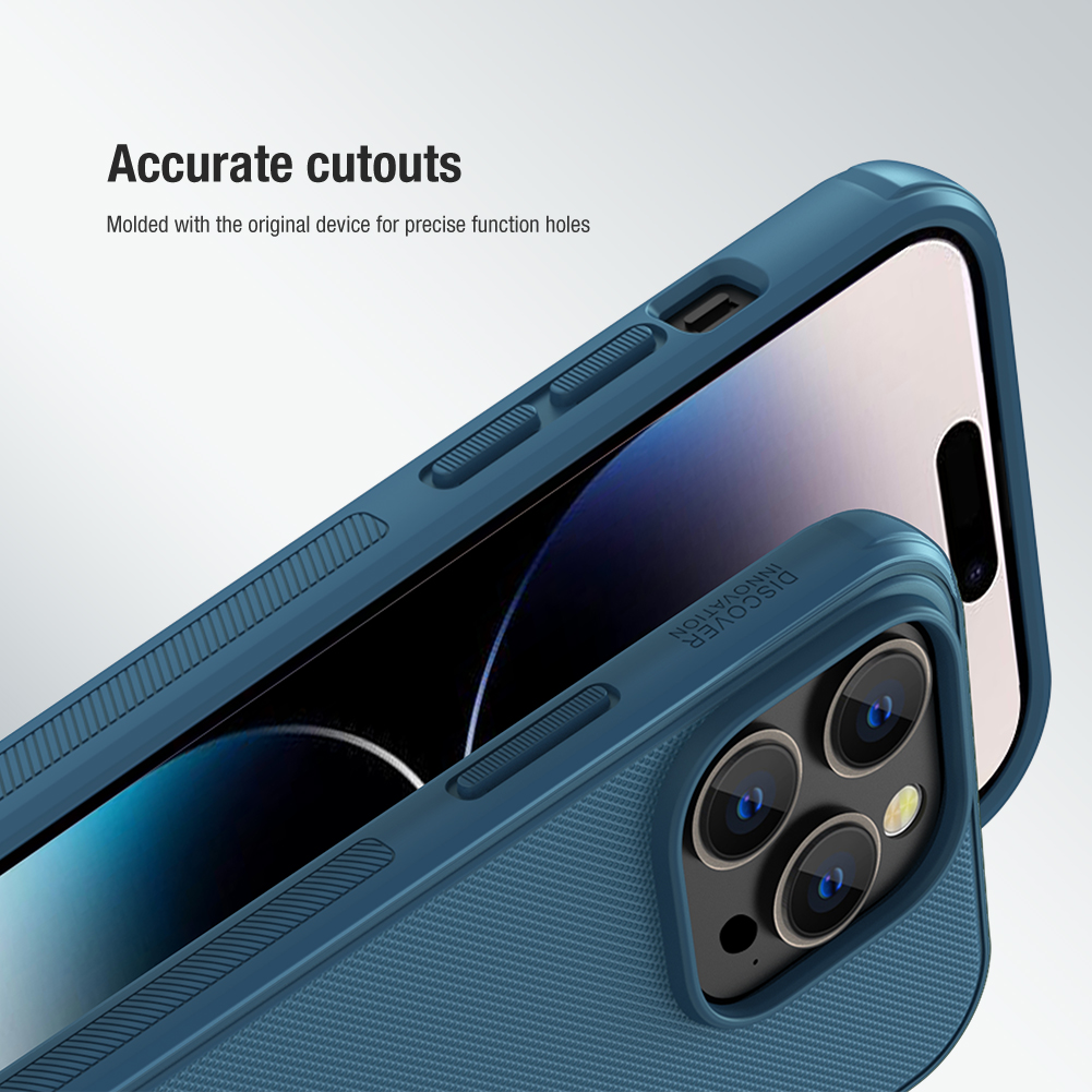 Защитный чехол синего цвета от Nillkin серии Super Frosted Shield Pro Magnetic для смартфона iPhone 14 Pro с усиленными боковыми рамками по четырем углам и поддержкой зарядки MagSafe, изготавливается из экологичных материалов PC и TPU путем высокоточного литья под давление с высокой температурой.