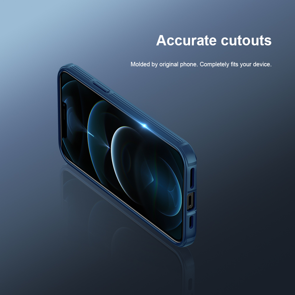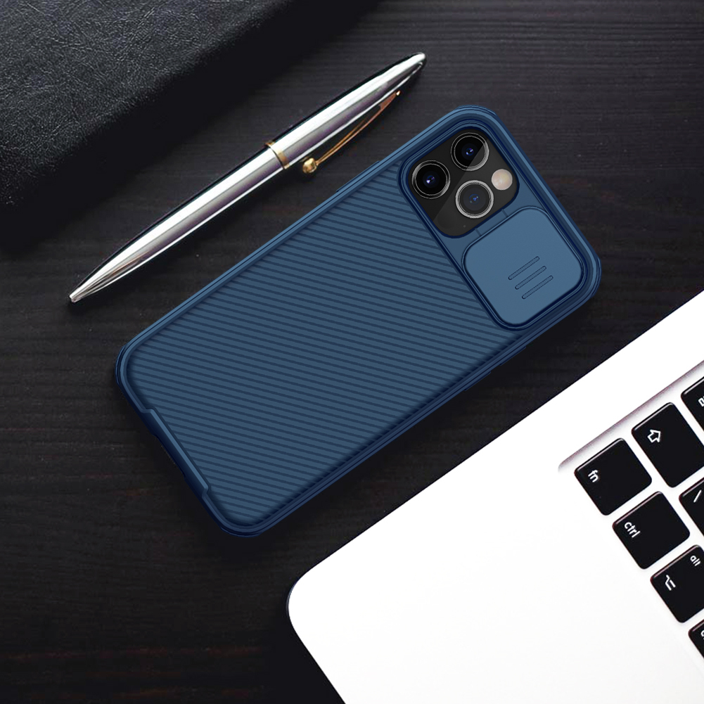Противоударный чехол синего цвета с защитной крышкой для задней камеры и беспроводной магнитной зарядкой MagSafe от Nillkin серии CamShield Pro Magnetic Case для смартфона iPhone 12 Pro Max.